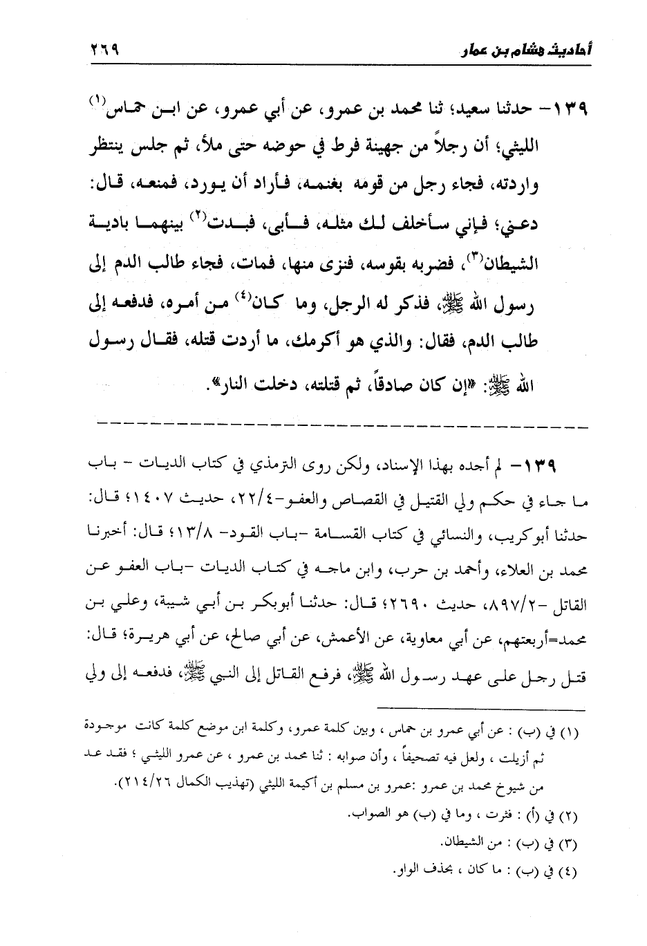 139 - حَدَّثَنَا سَعِيدٌ، ثنا مُحَمَّدُ بْنُ عَمْرٍو، عَنْ أَبِي عَمْرٍو، عَنِ ابْنِ حِمَاسٍ اللَّيْثِيِّ، أَنَّ رَجُلًا، مِنْ جُهَيْنَةَ فَرَطَ فِي حَوْضِهِ حَتَّى مَلَأَ، ثُمَّ جَلَسَ يَنْتَظِرُ وَارِدَتَهُ، فَجَاءَ رَجُلٌ مِنْ قَوْمِهِ بِغَنَمِهِ، فَأَرَادَ أَنْ يُورِدَ فَمَنَعَهُ، قَالَ: دَعْنِي، فَإِنِّي سَأُخَلِّفُ لَكَ مِثْلَهُ، فَأَبَى، فَبَدَتْ بَيْنَهُمَا بَادِيَةُ الشَّيْطَانِ، فَضَرَبَهُ بِقَوْسِهِ، فَنَزَى مِنْهَا، فَمَاتَ، فَجَاءَ طَالِبُ الدَّمِ إِلَى رَسُولِ اللَّهِ صَلَّى اللهُ عَلَيْهِ وَسَلَّمَ، فَذَكَرَ لَهُ الرَّجُلَ، وَمَا كَانَ مِنْ أَمْرِهِ، فَدَفَعَهُ إِلَى طَالِبِ الدَّمِ، فَقَالَ: وَالَّذِي هُوَ أَكْرَمَكَ، مَا أَرَدْتُ قَتْلَهُ، فَقَالَ رَسُولُ اللَّهِ صَلَّى اللهُ عَلَيْهِ وَسَلَّمَ: «§إِنْ كَانَ صَادِقًا، ثُمَّ قَتَلْتَهُ دَخَلْتَ النَّارَ»