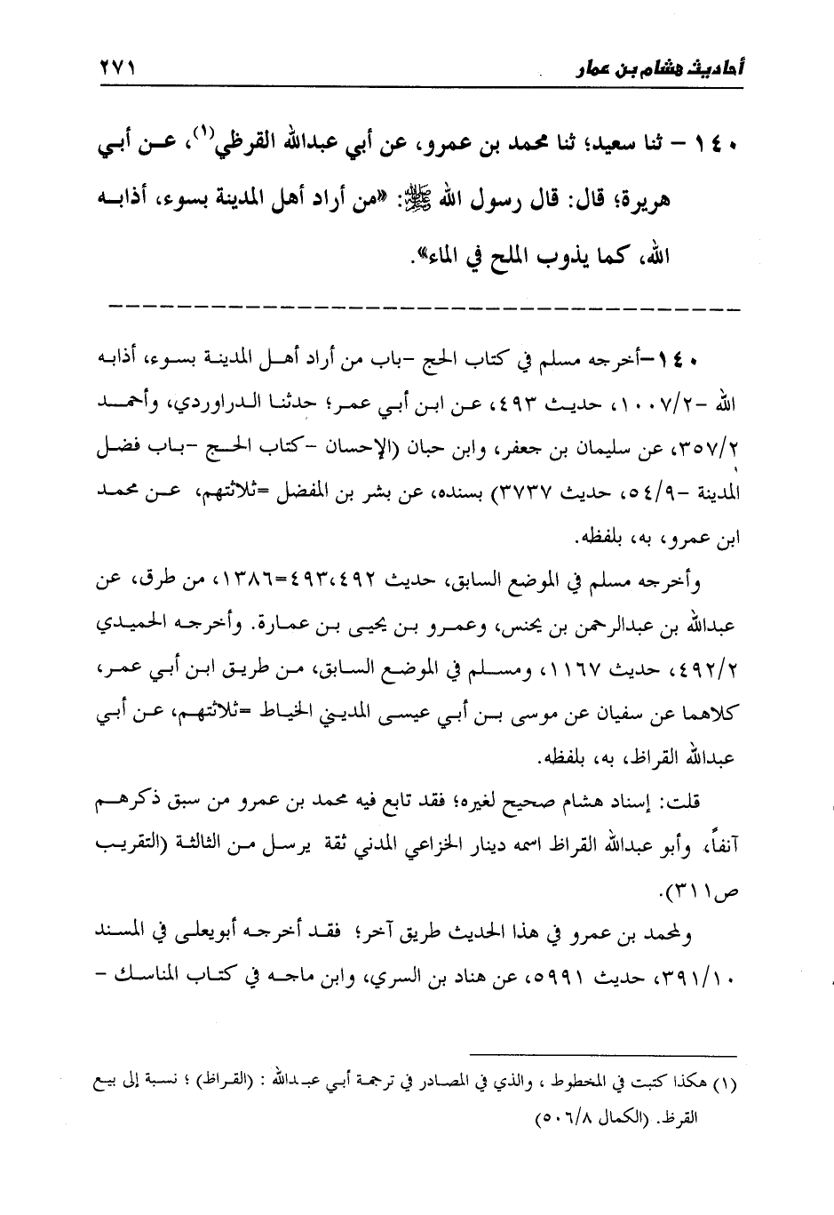 140 - ثنا سَعِيدٌ، ثنا مُحَمَّدُ بْنُ عَمْرٍو، عَنْ أَبِي عَبْدِ اللَّهِ الْقُرَظِيِّ، عَنْ أَبِي هُرَيْرَةَ قَالَ: قَالَ رَسُولُ اللَّهِ صَلَّى اللهُ عَلَيْهِ وَسَلَّمَ: «§مَنْ أَرَادَ أَهْلَ الْمَدِينَةِ بِسُوءٍ، أَذَابَهُ اللَّهُ كَمَا يَذُوبُ الْمِلْحُ فِي الْمَاءِ»