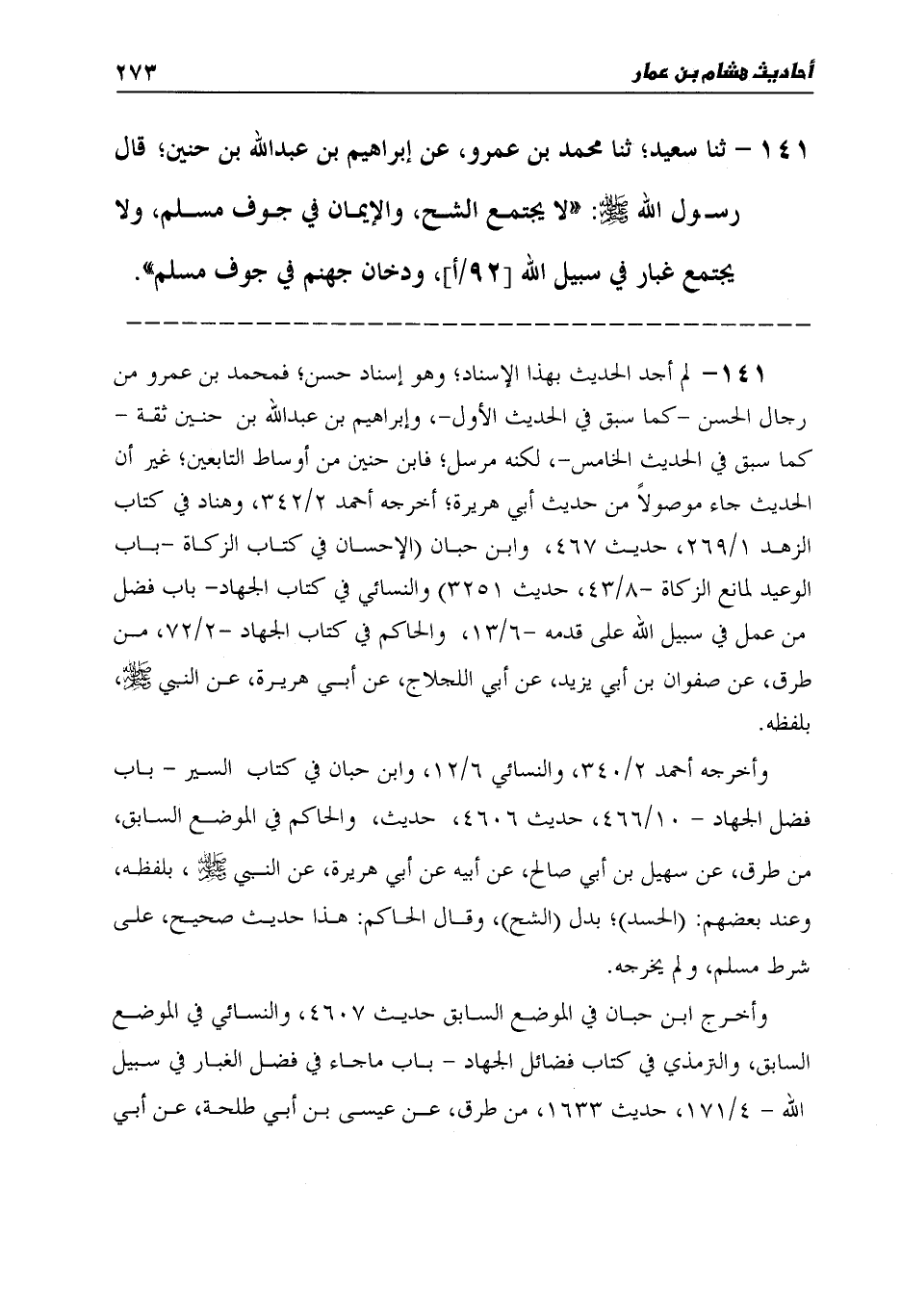 141 - ثنا سَعِيدٌ، ثنا مُحَمَّدُ بْنُ عَمْرٍو، عَنْ إِبْرَاهِيمَ بْنِ عَبْدِ اللَّهِ بْنِ حُنَيْنٍ، قَالَ رَسُولُ اللَّهِ صَلَّى اللهُ عَلَيْهِ وَسَلَّمَ: «§لَا يَجْتَمِعُ الشُّحُّ وَالْإِيمَانُ فِي جَوْفِ مُسْلِمٍ، وَلَا يَجْتَمِعُ غُبَارٌ فِي سَبِيلِ اللَّهِ، وَدُخَانُ جَهَنَّمَ فِي جَوْفِ مُسْلِمٍ»