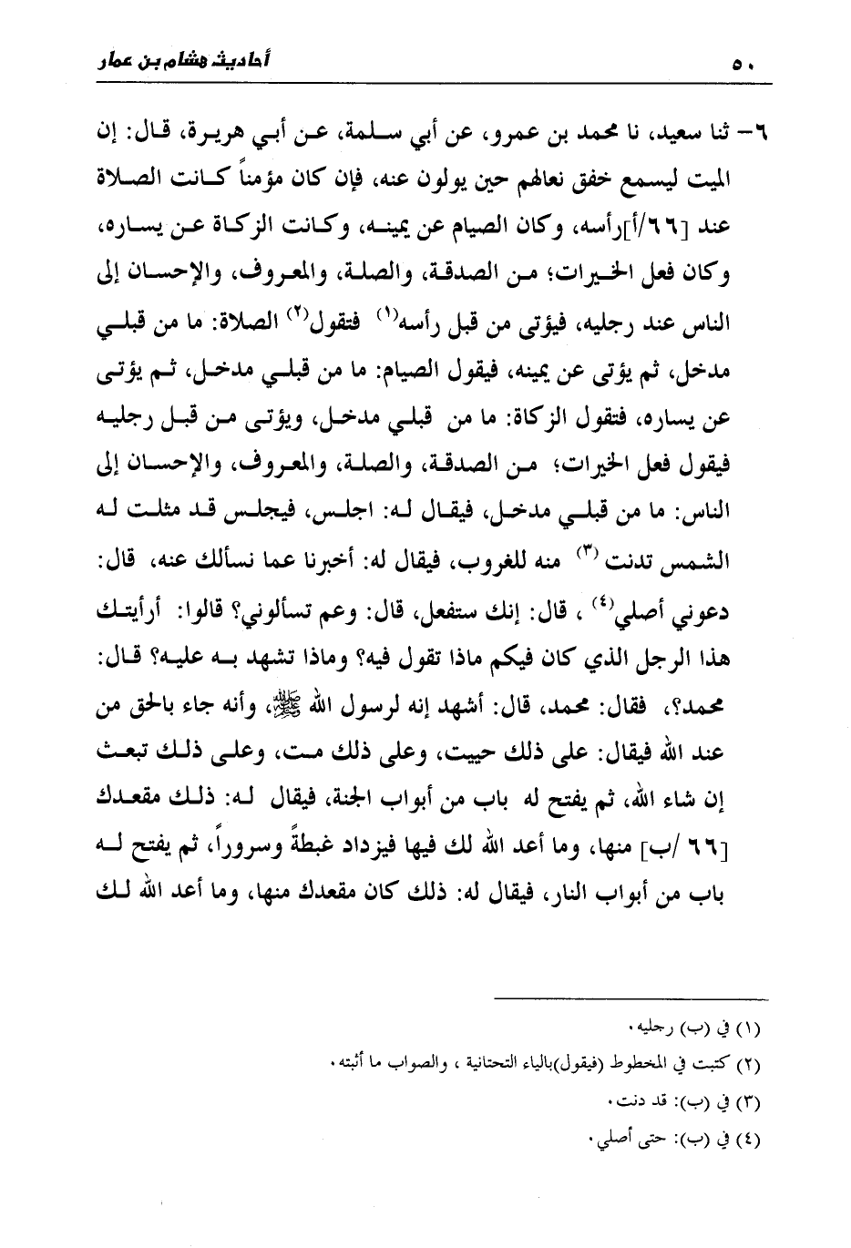 6 - ثنا سَعِيدٌ، نا مُحَمَّدُ بْنُ عَمْرٍو، عَنْ أَبِي سَلَمَةَ، عَنْ أَبِي هُرَيْرَةَ قَالَ: " §إِنَّ الْمَيِّتَ لَيَسْمَعُ خَفْقَ نِعَالِهِمْ حِينَ يُوَلُّونَ عَنْهُ، فَإِنْ كَانَ مُؤْمِنًا كَانَتِ الصَّلَاةُ عِنْدَ رَأْسِهِ، وَكَانَ الصِّيَامُ عَنْ يَمِينِهِ، وَكَانَتِ الزَّكَاةُ عَنْ يَسَارِهِ، وَكَانَ فِعْلُ الْخَيْرَاتِ مِنَ: الصَّدَقَةِ، وَالصِّلَةِ، وَالْمَعْرُوفِ، وَالْإِحْسَانِ إِلَى النَّاسِ عِنْدَ رِجْلَيْهِ، فَيُؤْتَى مِنْ قِبَلِ رَأْسِهِ، فَتَقُولُ الصَّلَاةُ: مَا مِنْ قَبْلِي مَدْخَلٌ، ثُمَّ يُؤْتَى عَنْ يَمِينِهِ، فَيَقُولُ الصِّيَامُ: مَا مِنْ قَبْلِي مَدْخَلٌ، ثُمَّ يُؤْتَى عَنْ يَسَارِهِ، فَتَقُولُ الزَّكَاةُ: مَا مِنْ قَبْلِي مَدْخَلٌ، وَيُؤْتَى مِنْ قِبَلِ رِجْلَيْهِ فَيَقُولُ فِعْلُ الْخَيْرَاتِ مِنَ: الصَّدَقَةِ، وَالصِّلَةِ، وَالْمَعْرُوفِ، وَالْإِحْسَانِ إِلَى النَّاسِ: مَا مِنْ قَبْلِي مَدْخَلٌ، فَيُقَالُ لَهُ: اجْلِسْ، فَيَجْلِسُ قَدْ مُثِّلَتْ لَهُ الشَّمْسُ تَدَنَّتْ مِنْهُ لِلْغُرُوبِ، فَيُقَالُ لَهُ: أَخْبِرْنَا عَمَّا نَسْأَلُكَ عَنْهُ، قَالَ: دَعُونِي أُصَلِّي، قَالَ: إِنَّكَ سَتَفْعَلُ، قَالَ: وَعَمَّ تَسْأَلُونِي؟ قَالُوا: أَرَأَيْتَكَ هَذَا الرَّجُلَ الَّذِي كَانَ فِيكُمْ، مَاذَا تَقُولُ فِيهِ؟ وَمَاذَا تَشْهَدُ بِهِ عَلَيْهِ؟ قَالَ: مُحَمَّدٌ؟ فَقَالَ: مُحَمَّدٌ، قَالَ: أَشْهَدُ إِنَّهُ لَرَسُولِ اللَّهِ صَلَّى اللهُ عَلَيْهِ وَسَلَّمَ، وَأَنَّهُ جَاءَ بِالْحَقِّ مِنْ عِنْدِ اللَّهِ، فَيُقَالُ: عَلَى ذَلِكَ حَيِيتَ، وَعَلَى ذَلِكَ مُتَّ، وَعَلَى ذَلِكَ تُبْعَثُ، إِنْ شَاءَ اللَّهُ، ثُمَّ يُفْتَحُ لَهُ بَابٌ مِنْ أَبْوَابِ الْجَنَّةِ، فَيُقَالُ لَهُ: ذَلِكَ مَقْعَدُكَ مِنْهَا، وَمَا أَعَدَّ اللَّهُ لَكَ فِيهَا، فَيَزْدَادَ غِبْطَةً وَسُرُورًا، ثُمَّ يُفْتَحُ لَهُ بَابٌ مِنْ أَبْوَابِ النَّارِ، فَيُقَالُ لَهُ: ذَلِكَ كَانَ مَقْعَدُكَ مِنْهَا، وَمَا أَعَدَّ اللَّهُ لَكَ -[51]- فِيهَا، فَيَزْدَادُ غِبْطَةً وَسُرُورًا، ثُمَّ يُفْتَحُ لَهُ فِي قَبْرِهِ سَبْعُونَ، وَيُنَوَّرُ لَهُ فِيهِ، وَتُجْعَلُ نَسَمَتُهُ فِي النَّسَمِ الطَّيِّبِ، وَهِيَ طَيْرٌ تَعَلَّقُ مِنْ شَجَرِ الْجَنَّةِ، وَيُعَادُ الْجَسَدُ إِلَى مَا بَدَا مِنْهُ مِنَ التُّرَابِ، قَالَ أَبُو هُرَيْرَةَ: قَالَ اللَّهُ عَزَّ وَجَلَّ: {يُثَبِّتُ اللَّهُ الَّذِينَ آمَنُوا بِالْقَوْلِ الثَّابِتِ فِي الْحَيَاةِ الدُّنْيَا وَفِي الْآخِرَةِ وَيُضِلُّ اللَّهُ الظَّالِمِينَ وَيَفْعَلُ اللَّهُ مَا يَشَاءُ} [إبراهيم: 27] ، فَقَالَ عُمَرُ بْنُ الْحَكَمِ: فَيَنَامُ نَوْمَةَ الْعَرُوسِ لَا يُوقِظُهُ إِلَّا أَحَبُّ أَهْلِهِ إِلَيْهِ حَتَّى يَبْعَثَهُ اللَّهُ، قَالَ أَبُو هُرَيْرَةَ: وَإِنْ كَانَ كَافِرًا، فَيُؤْتَى مِنْ رَأْسِهِ، فَلَا يُوجَدُ شَيْءٌ، ثُمَّ يُؤْتَى عَنْ يَمِينِهِ، فَلَا يُوجَدُ شَيْءٌ، ثُمَّ يُؤْتَى عَنْ يَسَارِهِ، فَلَا يُوجَدُ شَيْءٌ، ثُمَّ يُؤْتَى مِنْ قِبَلِ رِجْلَيْهِ، فَلَا يُوجَدُ شَيْءٌ، فَيُقَالُ: اجْلِسْ، فَيَجْلِسُ خَائِفًا مَرْعُوبًا، فَيُقَالُ لَهُ: أَخْبِرْنَا عَمَّا نَسْأَلُكَ عَنْهُ، فَيَقُولُ: وَعَمَّ تَسْأَلُونِي؟ قَالُوا: أَرَأَيْتَكَ هَذَا الرَّجُلَ الَّذِي كَانَ فِيكُمْ؟ مَاذَا تَقُولُ فِيهِ؟ وَمَاذَا تَشْهَدُ بِهِ عَلَيْهِ؟ قَالَ: أَيُّ رَجُلٍ هُوَ؟ فَيُقَالُ: الرَّجُلُ الَّذِي كَانَ فِيكُمْ، فَلَا يَهْتَدِي لِاسْمِهِ، حَتَّى يُقَالَ: مُحَمَّدٌ، قَالَ: مَا أَدْرِي، سَمِعْتُ النَّاسَ قَالُوا قَوْلًا فَقُلْتُ كَمَا قَالَ النَّاسُ، فَيُقَالُ لَهُ -[52]-: عَلَى ذَلِكَ حَيِيتَ، وَعَلَى ذَلِكَ مُتَّ، وَعَلَى ذَلِكَ تُبْعَثُ إِنْ شَاءَ اللَّهُ، ثُمَّ يُفْتَ