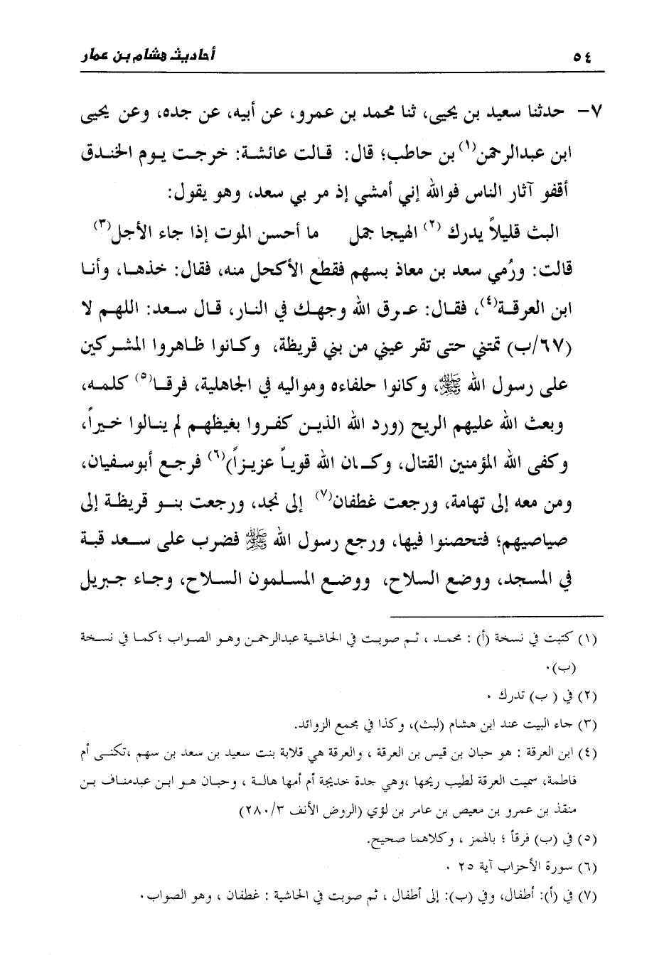 7 - حَدَّثَنَا سَعِيدُ بْنُ يَحْيَى، ثنا مُحَمَّدُ بْنُ عَمْرٍو، عَنْ أَبِيهِ، عَنْ جَدِّهِ، وَعَنْ يَحْيَى بْنِ عَبْدِ الرَّحْمَنِ بْنِ حَاطِبٍ قَالَ: قَالَتْ عَائِشَةُ: خَرَجْتُ يَوْمَ الْخَنْدَقِ أَقْفُو آثَارَ النَّاسِ، فَوَاللَّهِ إِنِّي أَمْشِي إِذْ مَرَّ بِي سَعْدٌ وَهُوَ يَقُولُ: