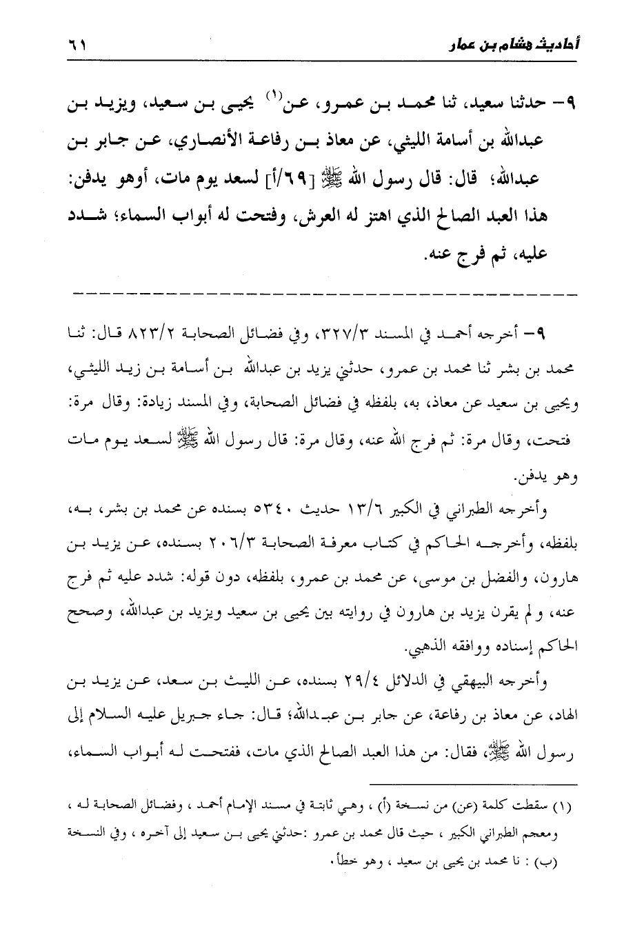 9 - حَدَّثَنَا سَعِيدٌ، ثنا مُحَمَّدُ بْنُ عَمْرٍو، عَنْ يَحْيَى بْنِ سَعِيدٍ، وَيَزِيدَ بْنِ عَبْدِ اللَّهِ بْنِ أُسَامَةَ اللَّيْثِيِّ، عَنْ مُعَاذِ بْنِ رِفَاعَةَ الْأَنْصَارِيِّ، عَنْ جَابِرِ بْنِ عَبْدِ اللَّهِ قَالَ: قَالَ رَسُولُ اللَّهِ صَلَّى اللهُ عَلَيْهِ وَسَلَّمَ لِسَعْدٍ يَوْمَ مَاتَ، أَوْ وَهُوَ يُدْفَنُ: «§هَذَا الْعَبْدُ الصَّالِحُ الَّذِي اهْتَزَّ لَهُ الْعَرْشُ، وَفُتِحَتْ لَهُ أَبْوَابُ السَّمَاءِ، شُدِّدَ عَلَيْهِ، ثُمَّ فُرِّجَ عَنْهُ»