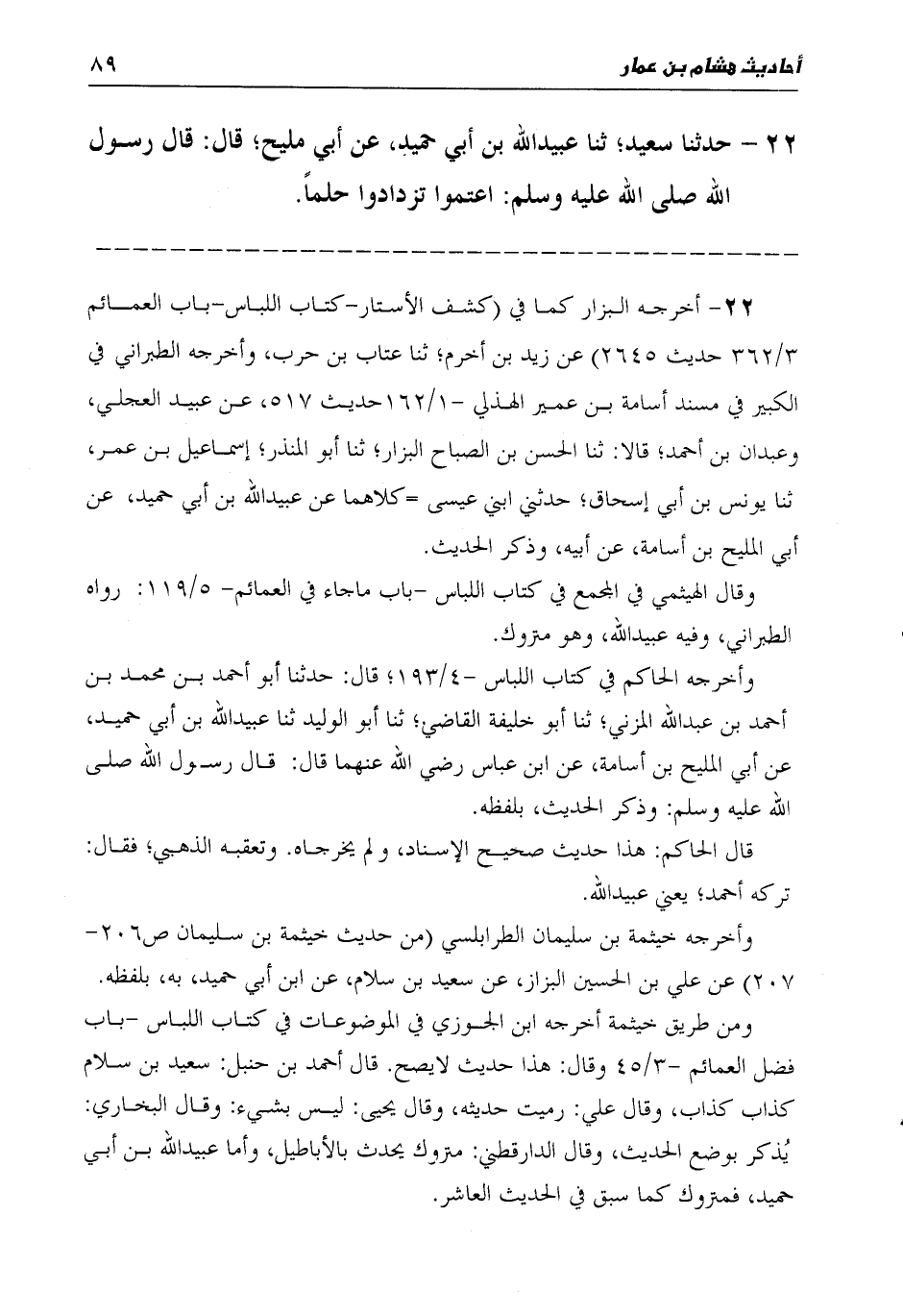 22 - حَدَّثَنَا سَعِيدٌ، ثنا عُبَيْدُ اللهِ بْنُ أَبِي حُمَيْدٍ، عَنْ أَبِي مَلِيحٍ قَالَ: قَالَ رَسُولُ اللَّهِ صَلَّى اللهُ عَلَيْهِ وَسَلَّمَ: «§اعْتَمُّوا تَزْدَادُوا حِلْمًا»