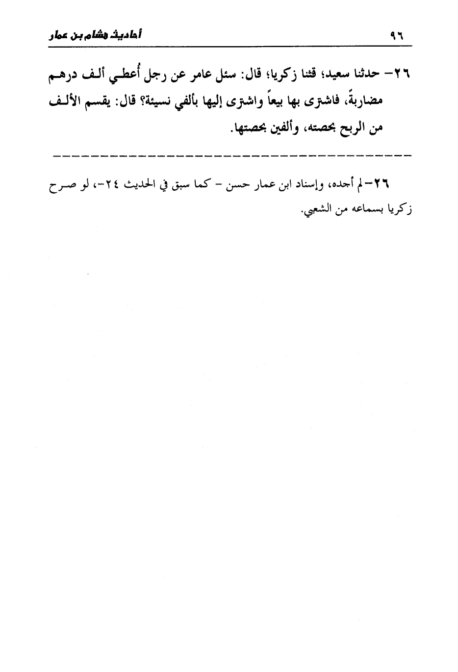 26 - حَدَّثَنَا سَعِيدٌ، قثنا زَكَرِيَّا، قَالَ: سُئِلَ عَامِرٌ عَنْ رَجُلٍ أُعْطِيَ أَلْفَ دِرْهَمٍ مُضَارَبَةً فَاشْتَرَى بِهَا بَيْعًا، وَاشْتَرَى إِلَيْهَا بِأَلْفَيْ نَسِيئَةٍ؟ قَالَ: «§يَقْسِمُ الْأَلْفَ مِنَ الرِّبْحِ بِحِصَّتِهِ، وَأَلْفَيْنِ بِحِصَّتِهَا»