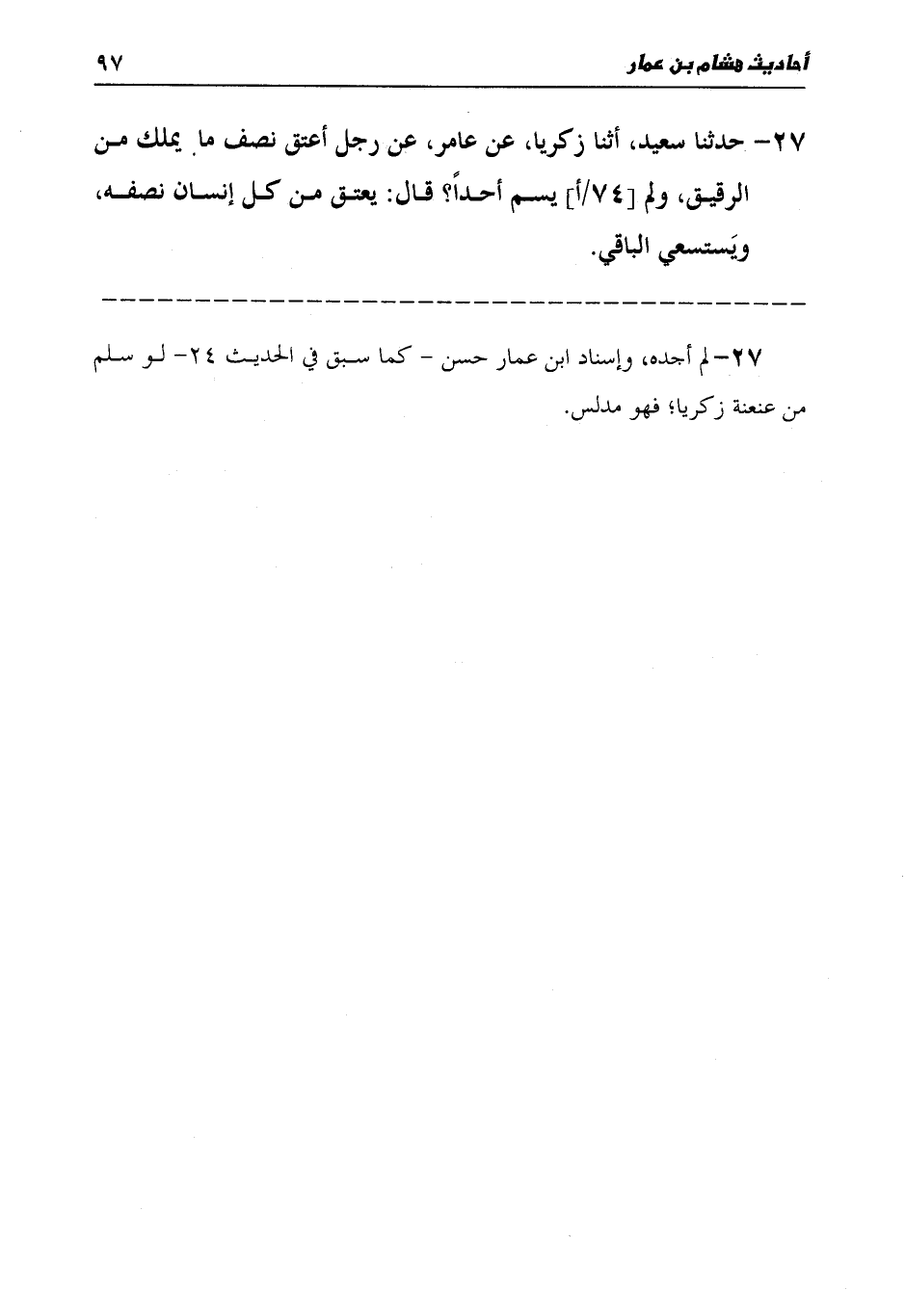 27 - حَدَّثَنَا سَعِيدٌ، أثنا زَكَرِيَّا، عَنْ عَامِرٍ عَنْ رَجُلٍ أَعْتَقَ نِصْفَ مَا يَمْلِكُ مِنَ الرَّقِيقِ، وَلَمْ يُسَمِّ أَحَدًا؟ قَالَ: «§يُعْتِقُ مِنْ كُلِّ إِنْسَانٍ نِصْفَهُ، وَيَسْتَسْعِي الْبَاقِيَ»