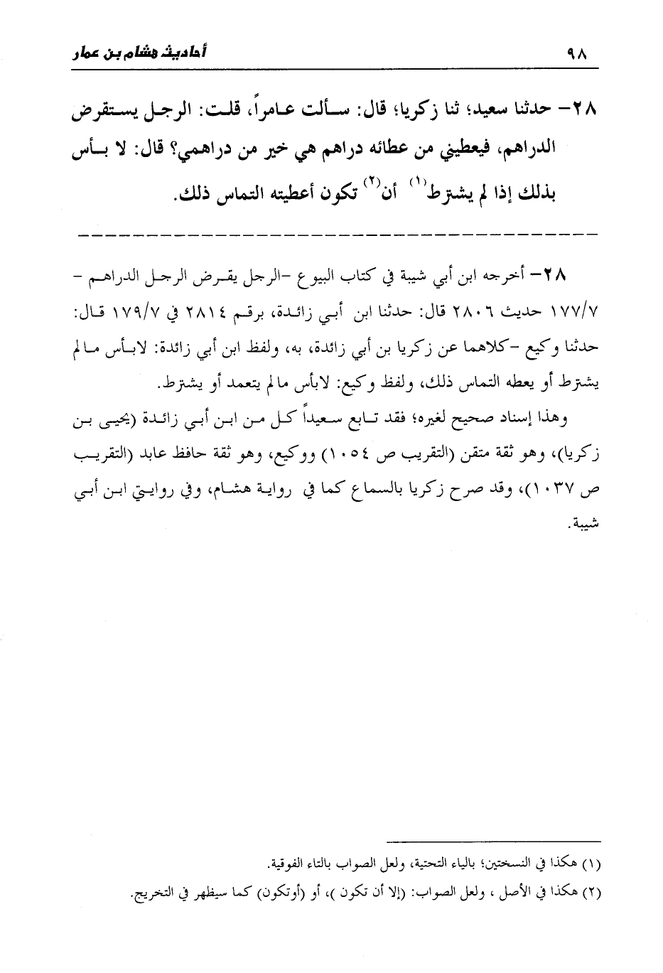 28 - حَدَّثَنَا سَعِيدٌ، ثنا زَكَرِيَّا قَالَ: سَأَلْتُ عَامِرًا، قُلْتُ: الرَّجُلُ يَسْتَقْرِضُ الدَّرَاهِمَ، فَيُعْطِينِي مِنْ عَطَائِهِ دَرَاهِمَ هِيَ خَيْرٌ مِنْ دَرَاهِمِي؟ قَالَ: «§لَا بَأْسَ بِذَلِكَ إِذَا لَمْ يَشْتَرِطْ أَنْ تَكُونَ أَعْطَيْتَهُ الْتِمَاسَ ذَلِكَ»