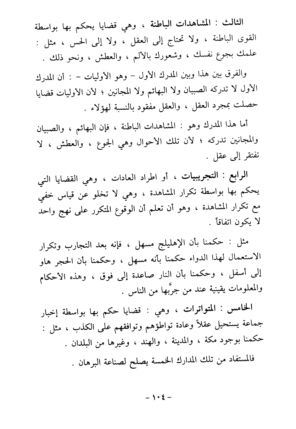 الثالث: المشاهدات الباطنة، وهي قضايا يحكم بها بواسطة