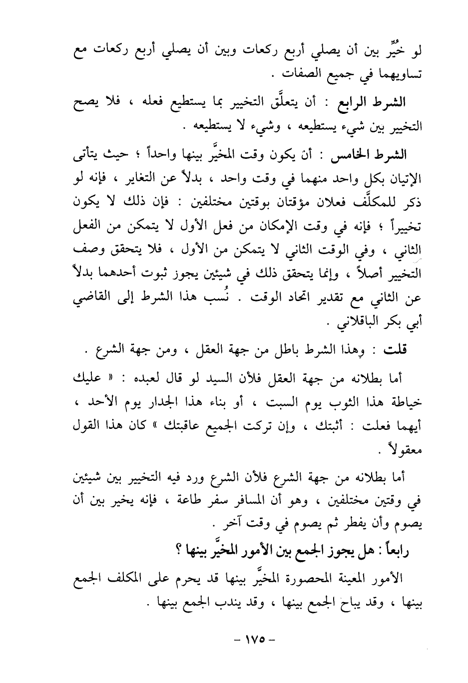 التخيير أصلاً، وإنما يتحقق ذلك في شيئين يجوز ثبوت أحدهما بدلاً