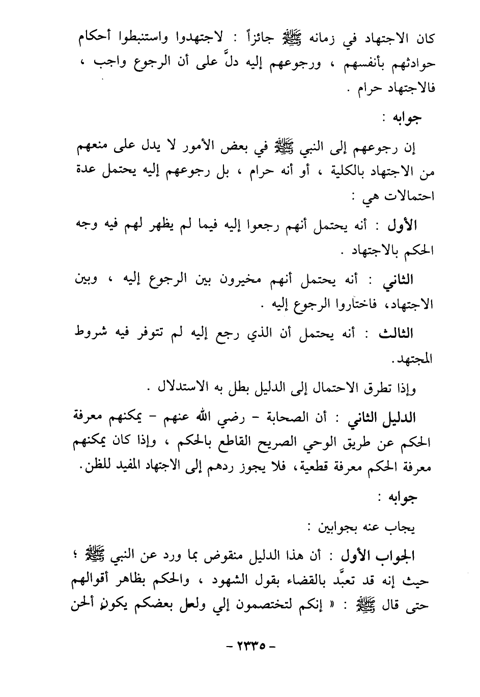 كان الاجتهاد في زمانه - صلى الله عليه وسلم - جائزاً: لاجتهدوا واستنبطوا أحكام حوادثهم بأنفسهم، ورجوعهم إليه دلَّ على أن الرجوع واجب، فالاجتهاد حرام.