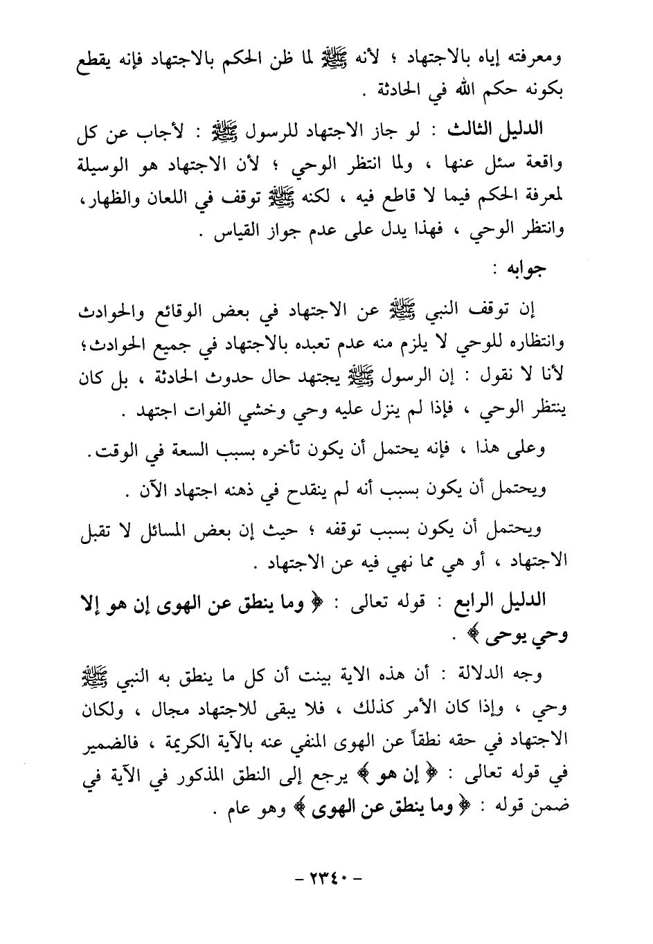 الدليل الثالث: لو جاز الاجتهاد للرسول - صلى الله عليه وسلم -: لأجاب عن كل واقعة سئل عنها، ولما انتظر الوحي؛ لأن الاجتهاد هو الوسيلة لمعرفة الحكم فيما لا قاطع فيه، لكنه - صلى الله عليه وسلم - توقف في اللعان والظهار، وانتظر الوحي، فهذا يدل على عدم جواز القياس.