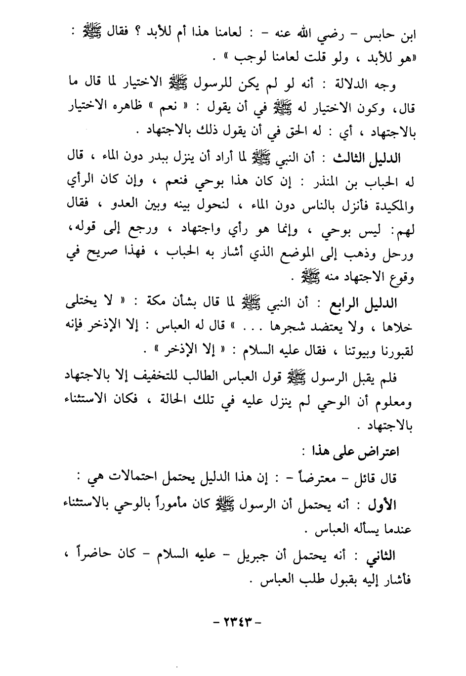 فلم يقبل الرسول - صلى الله عليه وسلم - قول العباس الطالب للتخفيف إلا بالاجتهاد ومعلوم أن الوحي لم ينزل عليه في تلك الحالة، فكان الاستثناء