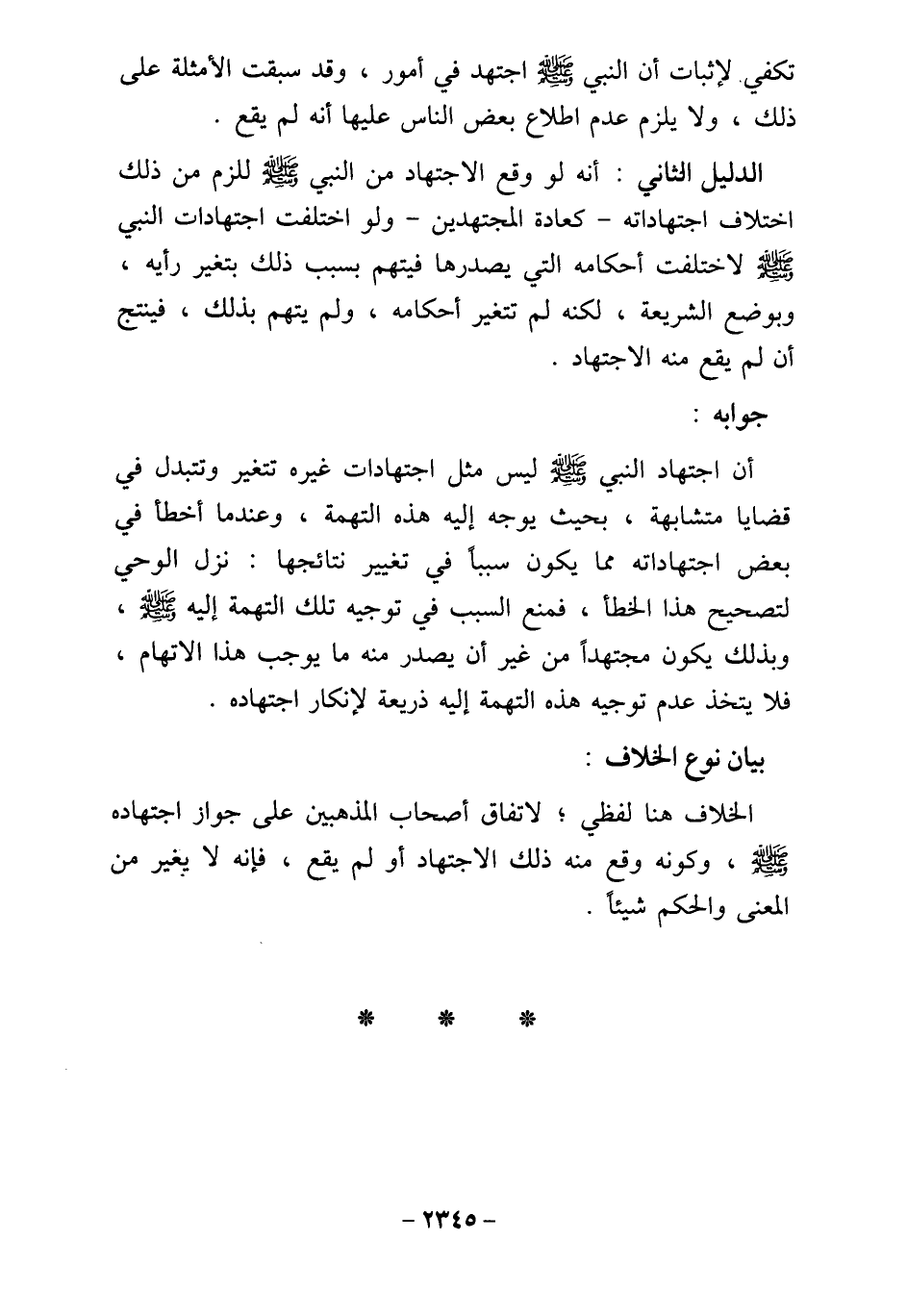 الدليل الثاني: أنه لو وقع الاجتهاد من النبي - صلى الله عليه وسلم - للزم من ذلك اختلاف اجتهاداته - كعادة المجتهدين - ولو اختلفت اجتهادات النبي - صلى الله عليه وسلم - لاختلفت أحكامه التي يصدرها فيتهم بسبب ذلك بتغير رأيه، وبوضع الشريعة، لكنه لم تتغير أحكامه، ولم يتهم بذلك، فينتج أن لم يقع منه الاجتهاد.