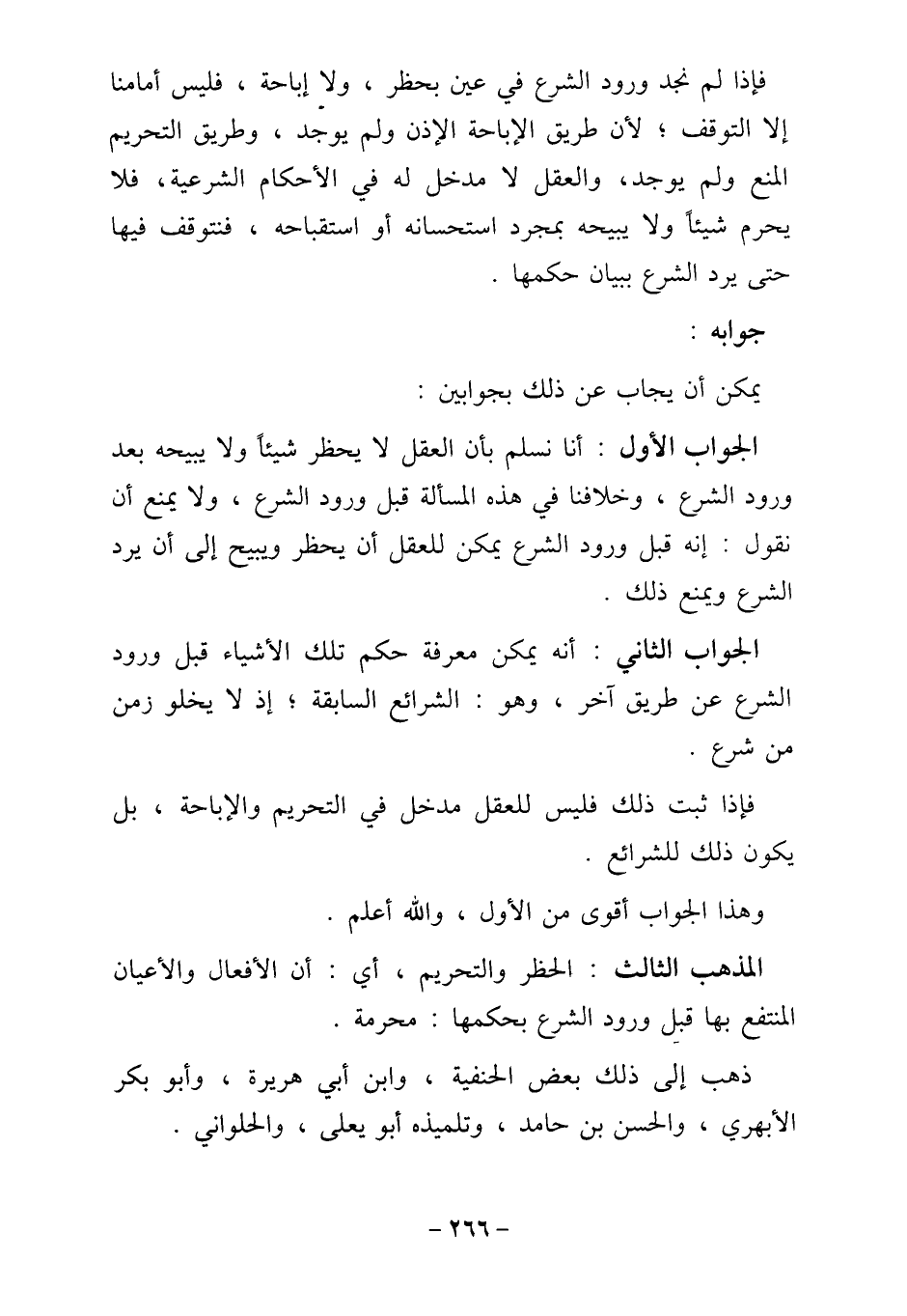الجواب الأول: أنا نسلم بأن العقل لا يحظر شيئاً ولا يبيحه بعد