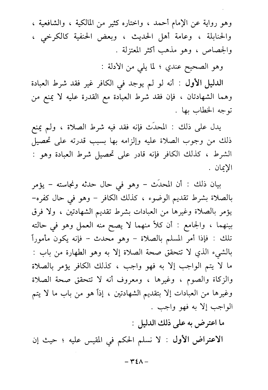 الدليل الأول: أنه لو لم يوجد في الكافر غير فقد شرط العبادة