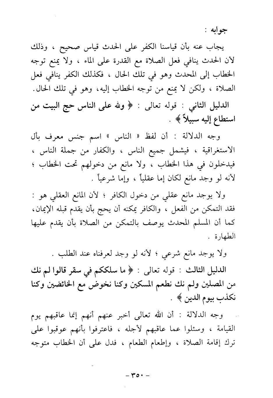الدليل الثالث: قوله تعالى: (مَا سَلَكَكُمْ فِي سَقَرَ (42) قَالُوا لَمْ نَكُ مِنَ الْمُصَلِّينَ (43) وَلَمْ نَكُ نُطْعِمُ الْمِسْكِينَ (44) وَكُنَّا نَخُوضُ مَعَ الْخَائِضِينَ (45) وَكُنَّا نُكَذِّبُ بِيَوْمِ الدِّينِ (46) .