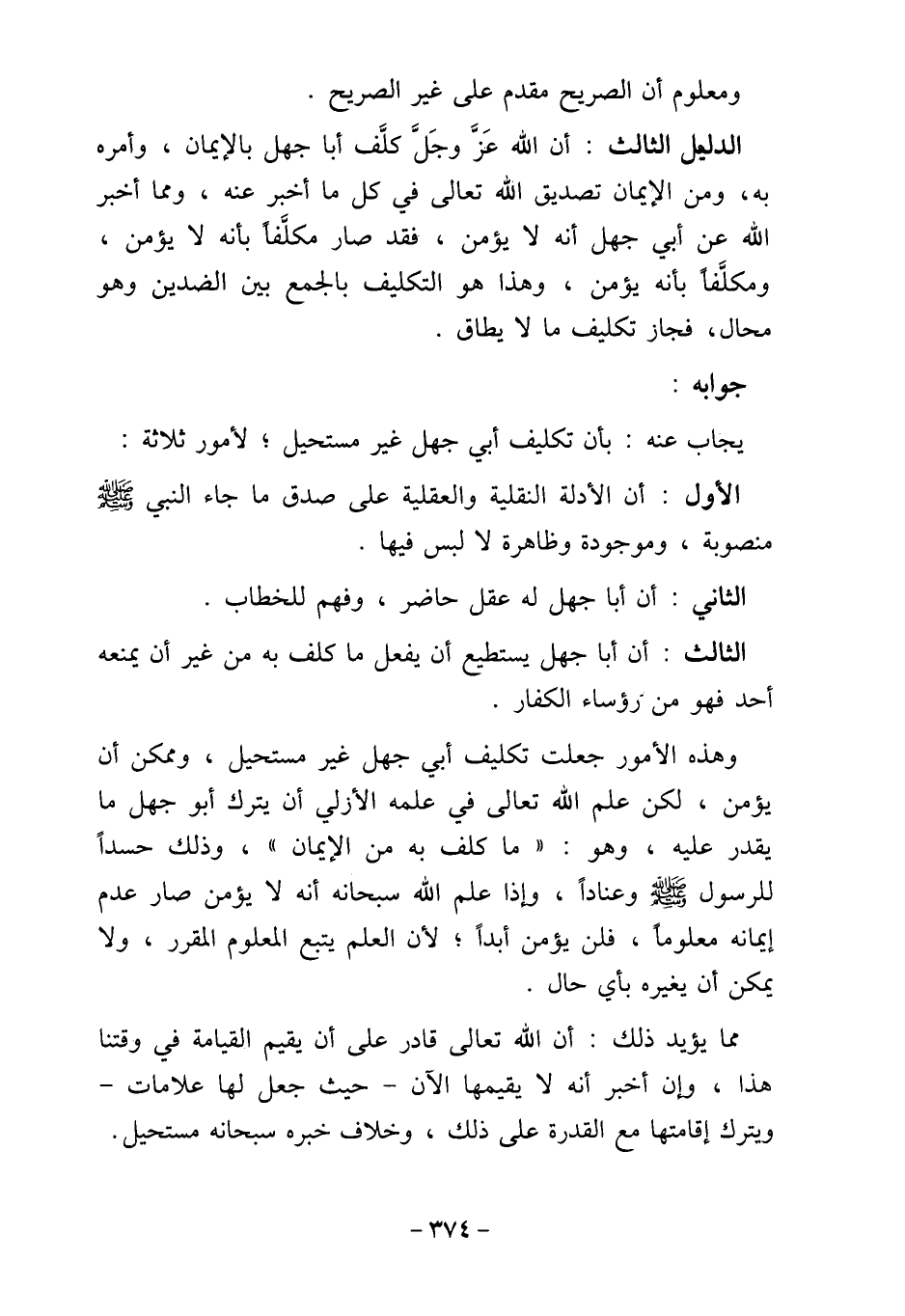 الدليل الثالث: أن اللَّه عَزَّ وجَلَّ كلَّف أبا جهل بالإيمان، وأمره