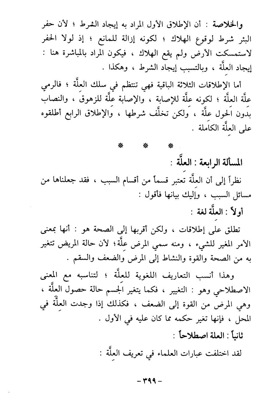 نظراً إلى أن العلَّة تعتبر قسما من أقسام السبب، فقد جعلناها من