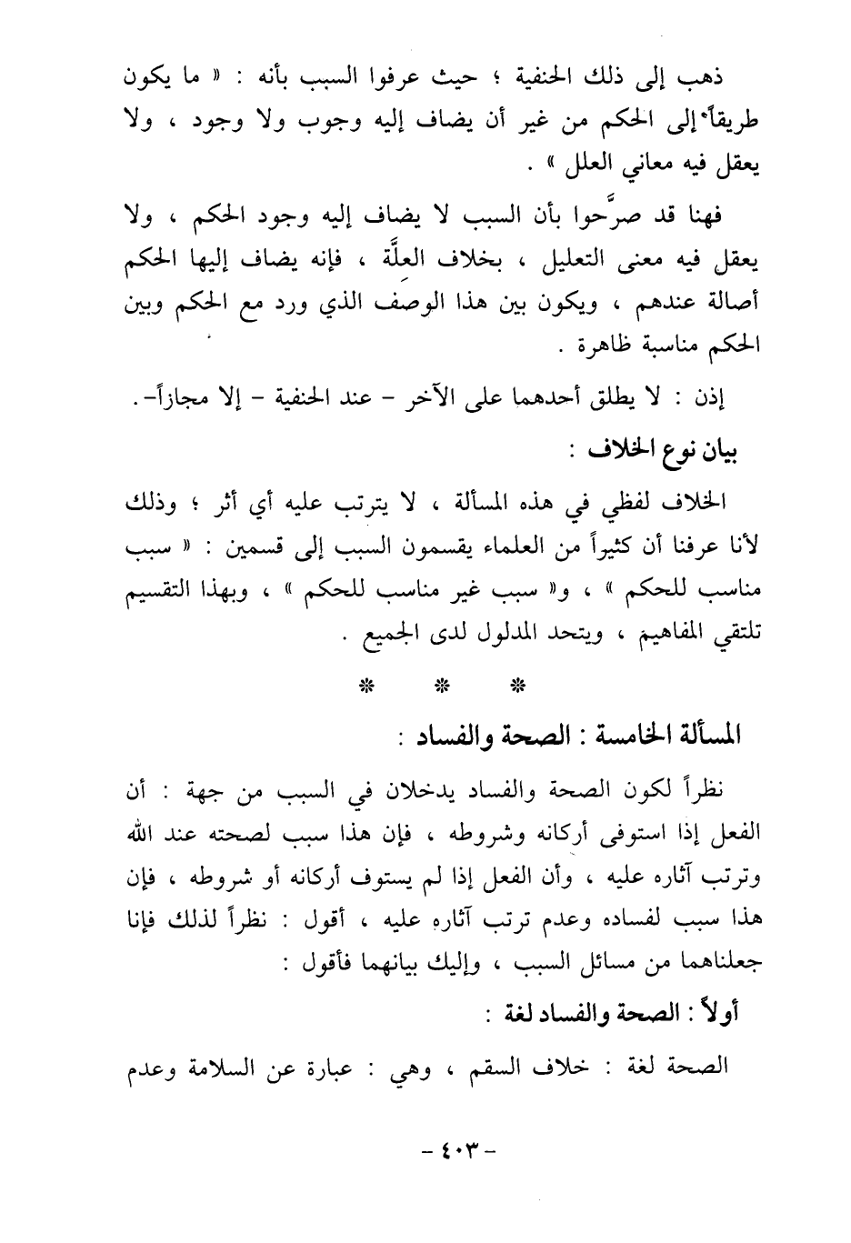 نظراً لكون الصحة والفساد يدخلان في السبب من جهة: أن