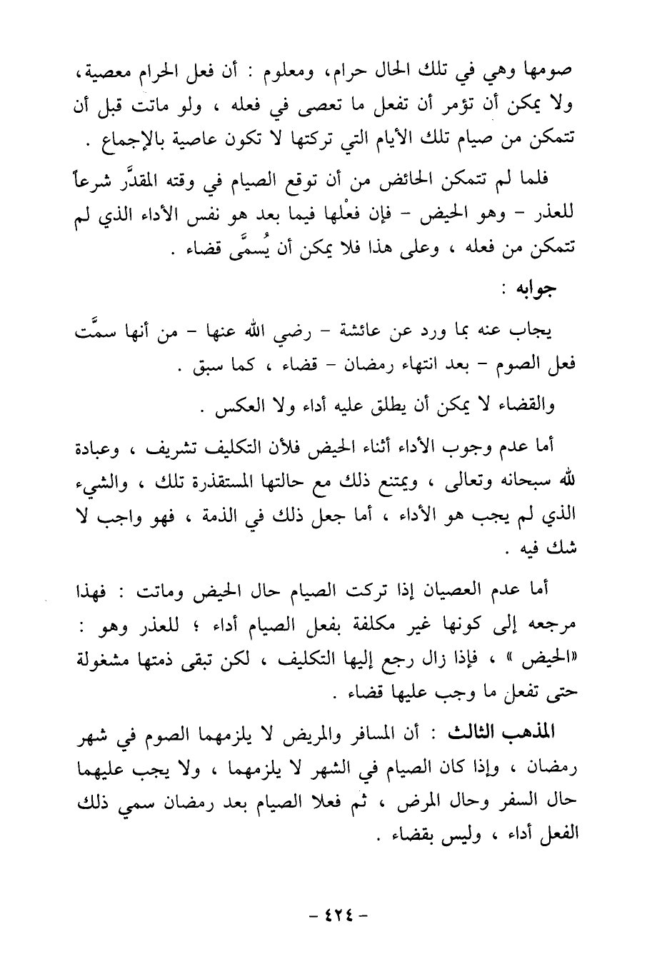 "الحيض "، فإذا زال رجع إليها التكليف، لكن تبقى ذمتها مشغولة