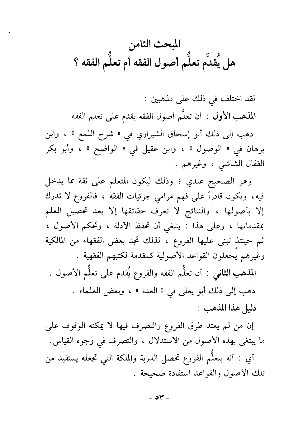 المبحث الثامن هل يُقدَّم تعلُّم أصول الفقه أم تعلُّم الفقه؟