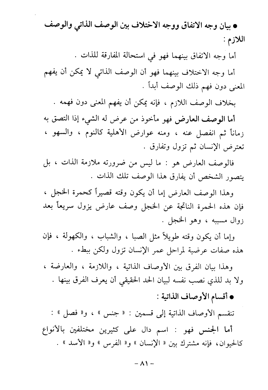وهذا بيان الفرق بين الأوصاف الذاتية، واللازمة، والعارضة،