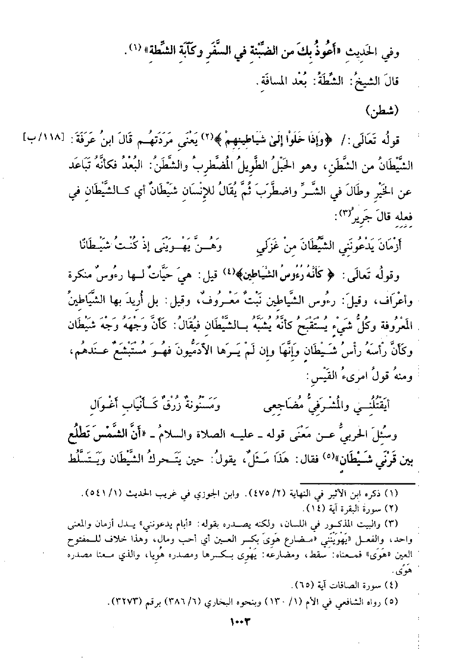 وسئل الحربي عن معنى قوله- عليه الصلاة والسلام- (أن الشمس تطلع بين قرني شيطان) فقال: هذا مثل، يقول: حين يتحرك الشيطان ويتسلط