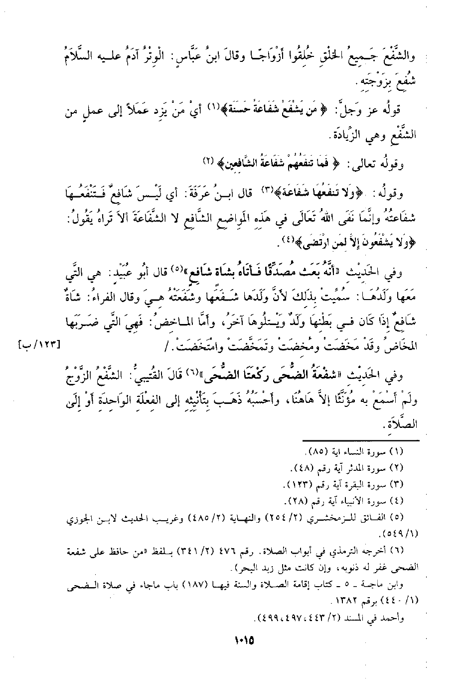 وفي الحديث (شفعة الضحى ركعتا الضحى) قال القتيبي: الشفع الزوج ولم أسمع به مؤنثًا إلا هاهنا، أحسبه ذهب بتأنيثه إلى الفعلة الواحدة أو إلى الصلاة.
