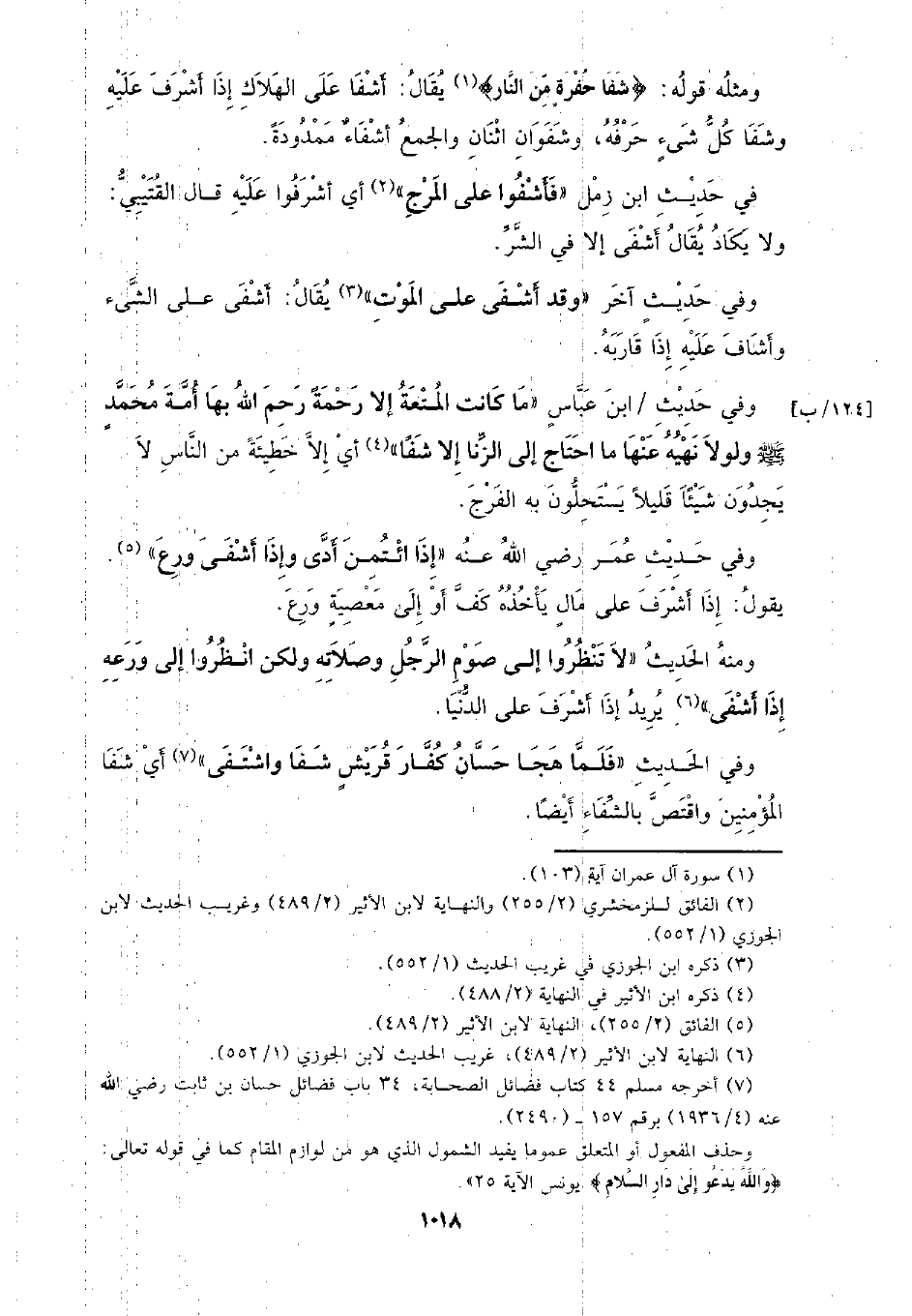 ومثله قوله: {شفا حفرة من النار} يقال: أشفا على الهلاك إذا أشرف عليه وشفا كل شيء حرفه، وشفوان اثنان والجمع أشفاء ممدودة.