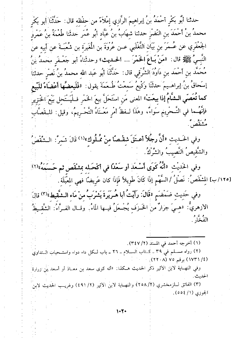 حدثنا أبو بكر أحمد بن إبراهيم الرازي إملاء من حفظه قال: حدثنا أبو بكر محمد بن أحمد بن النضر حدثنا شهاب بن عباد أبو عمر حدثنا طعمة بن عمرو الجعفري عن عمر بن بيان التغلبي عن عروة بن المغيرة بن شعبة عن أبيه عن النبي - صلى الله عليه وسلم - قال: (من باع الخمر ... الحديث) وحدثناه أبو جعفر محمد بن محمد بن أحمد بن داود الشرقي قال: حدثنا أبو عبد الله محمد بن نصر حدثنا إسحاق بن إبراهيم حدثنا وكيع سمعت طعمة يقول: (فليعضها أعضاء للبيع كما تعصي الشام إذا بيعت) المعنى من استحل بيع الخمر فليستحل بيع الخنزير فإنهما في التحريم ساء، وهذا لفظ أمر معناه التحريم، وقيل: للقصاب مشقص.