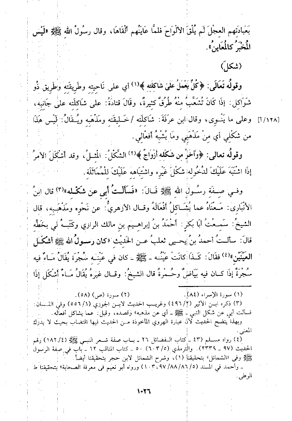 وفي صفة رسول الله - صلى الله عليه وسلم - قال: (فسألت أبي عن شكله) قال ابن الأنبا ري: معناه عما يشكل أفعاله وقال الأزهري: عن نحوه ومذهبه، قال الشيخ: سمعت أبا بكر: أحمد بن إبراهيم بن مالك الرازي وكتبه لي بخطه قال: سألت أحمد بن يحيي ثعلب عن الحديث (كان رسول الله - صلى الله عليه وسلم - أشكل العينين) فقال: كذا كانت عينه - صلى الله عليه وسلم - كان في عينه سحرة يقال ماء فيه سحرة إذا كان فيه بياض وحمرة قال الشيخ: وقال غيره ماء أشكل إذا