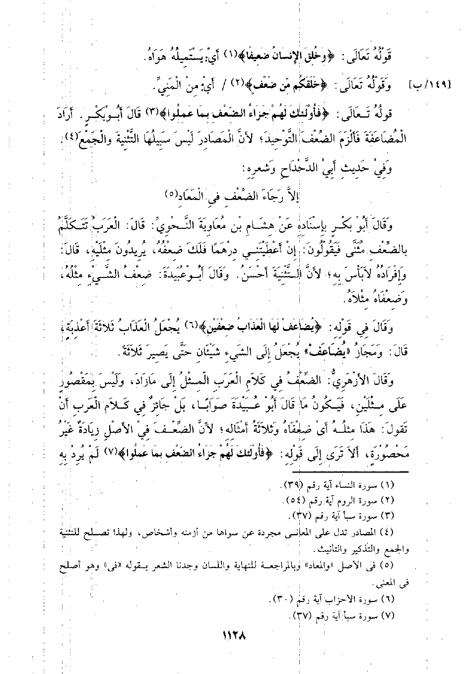 وقال أبو بكر بإسناده عن هشام بن معاوية النحوي: قال: العرب تتكلم بالضعف مثنى فيقولون: إن أعطيتني درهعمًا فلك ضعفه، يريدون مثليه، قال: وإفراده لا بأس به، لان التثنية أحسن. وقال أبو عبيدة: ضعف الشيء مثله، وضعفاه مثلاه.