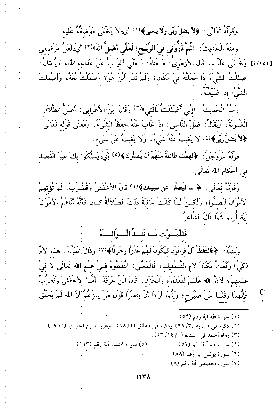 ومنه الحديث: (إني أضللت ناقتي) وقال ابن الأعرابي: أضل الظلال: الغيبوبة، ويقال: ضل الناسي: إذا غاب عنه حفظ الشيء، ومعنى قوله تعالى: {لا يضل ربي} لا يغيب عنه شيء، ولا يغيب عن شيء.