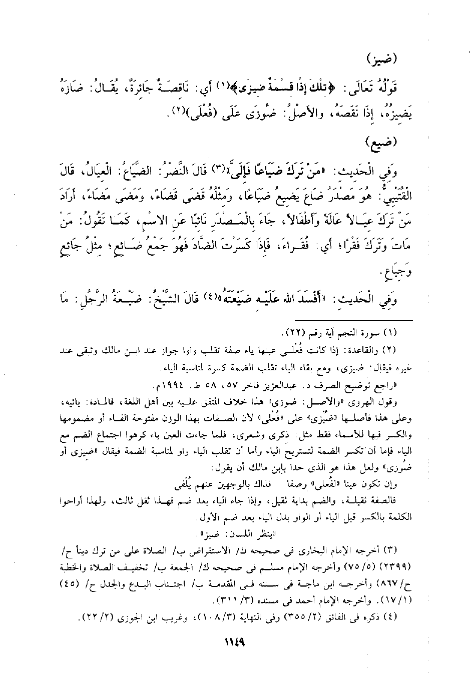 وفي الحديث: (من ترك ضياعًا فإلي) قال النضر: الضياع: العيال، قال القتيبي: هو مصدر ضاع يضيع ضياعًا، ومثله قضى قضاء، ومضى مضاء، أراد من ترك عيالًا عالة وأطفالًا، جاء بالمصدر نائبًا عن الاسم، كما تقول: من مات وترك فقرًا؛ أي: فقراء، فإذا كسرت الضاد فهو جمع ضائع؛ مثل جائع وجياع.