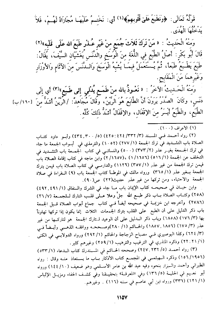 ومنه الحديث: (من ترك ثلاث جمع من غير عذر طبع الله على قلبه) قال أبو بكر: أصل الطبع في اللغة من الوسخ والدنس يغشيان السيف، يقال: طبع يطبع طبعا، ثم يستعمل فيما يشبه الوسخ والدنس من الآثام والأوزار وغيرهما من المقابح.