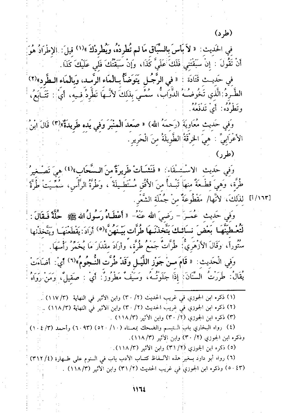 وفي حديث عمر- رضي الله عنه- (أعطاه رسول الله - صلى الله عليه وسلم - حلة فقال: لتعطينها بعض نسائك يتخذنها طرات بينهن) أراد: يقطعنها ويتخذنها ستورا، وقال الأزهري: طرات جمع طرة، وأراد مقدار ما يخمر رأسها.