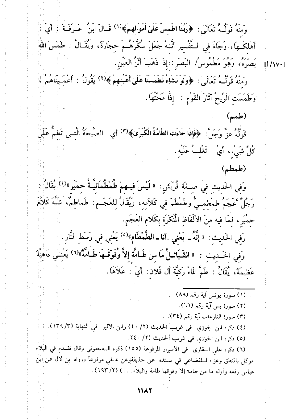 ومنه قوله تعالى: {ربنا اطمس على أموالهم} قال ابن عرفة: أي: أهلكها، وجاء في التفسير أنه جعل سكرهم حجارة، ويقال: طمس الله بصره، وهو مطموس/ البصر: إذا ذهب أثر العين.