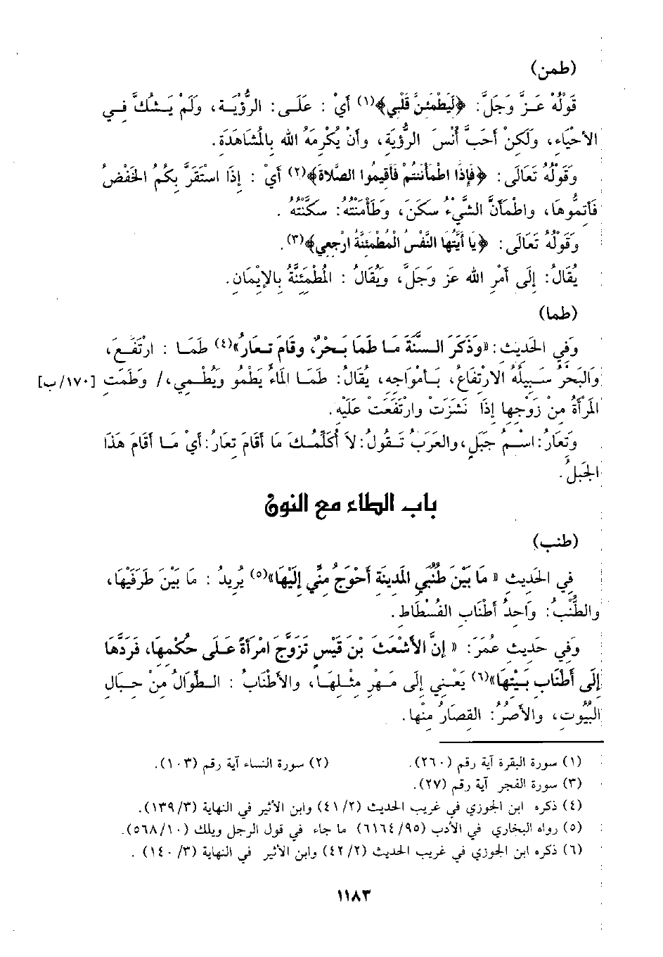 في الحديث: (ما بين طنبي المدينة أحوج مني إليها) يريد: ما ين طرفيها، والطنب: واحد أطناب الفسطاط.