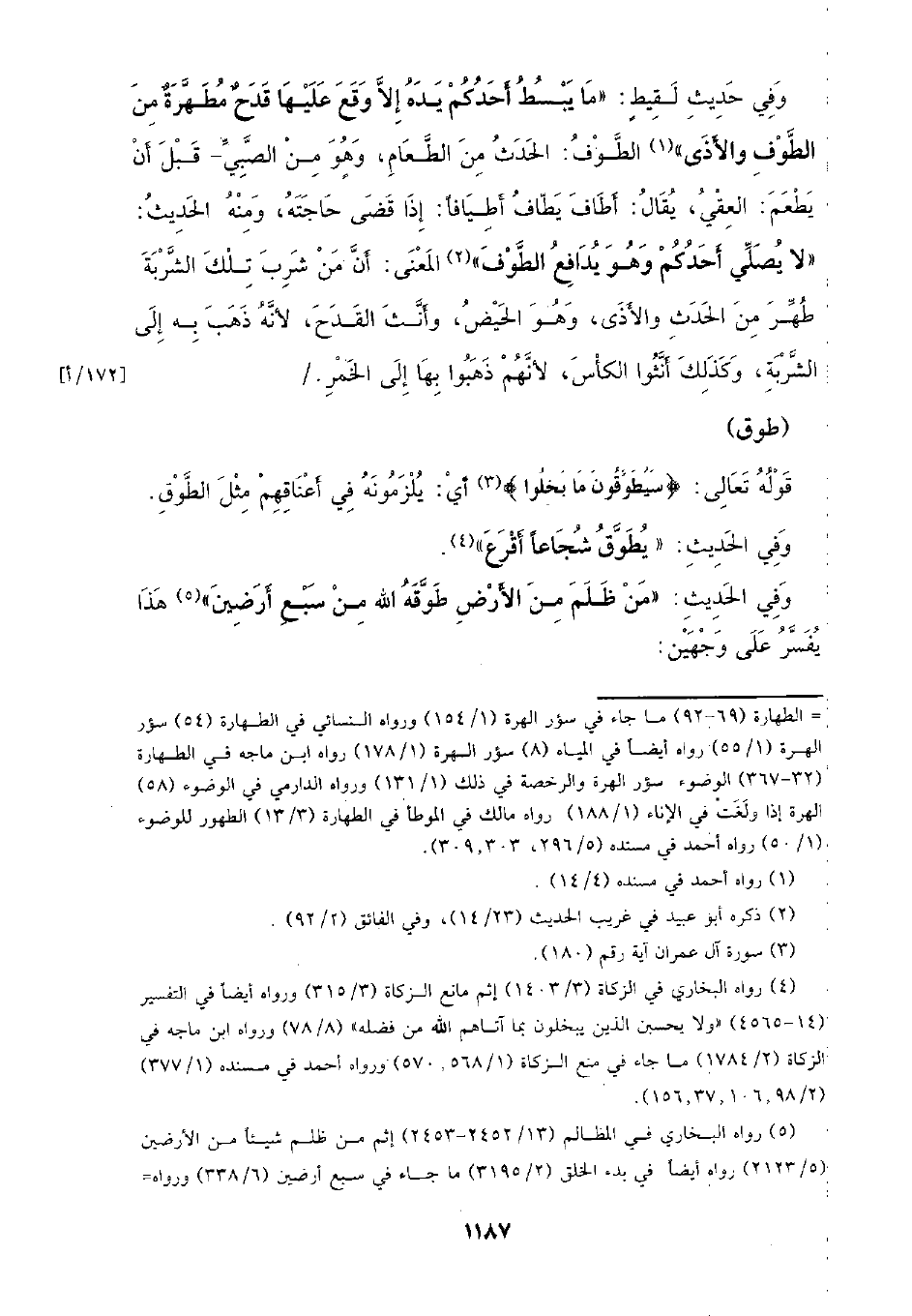 وفي حديث لقيط: (ما يبسط أحدكم يده إلا وقع عليها قدح مطهرة من الطوف والأذى) الطوف: الحدث من الطعام، وهو من الصبي- قبل أن يطعم: العقي: يقال: أطاف يطاف أطيافا: إذا قضى حاجته، ومنه الحديث: (لا يصلي أحدكم وهو يدافع الطوف) المعنى: أن من شرب تلك الشربة طهر من الحدث والأذى، وهو الحيض، وأنث القدح، لأنه ذهب به إلى الشربة، وكذلك أنثوا الكأس، لأنهم ذهبوا بها إلى الخمر./