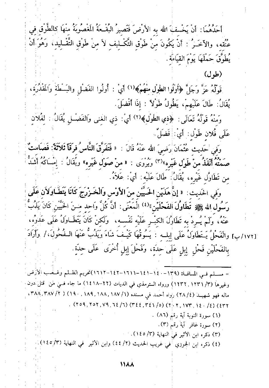 ومنه قوله تعالى: {ذي الطول} أي: ذي الغنى والفضل يقال: لفلان على فلان طول: أي: فضل.