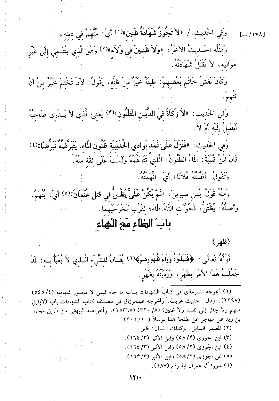 وفي الحدث: (فنزل على ثمد بوادي الحديبية ظنون الماء، يتربضه تبرضا) قال ابن قتيبة: الماء الظنون: الذي تتوهمه ولست على ثقة منه.