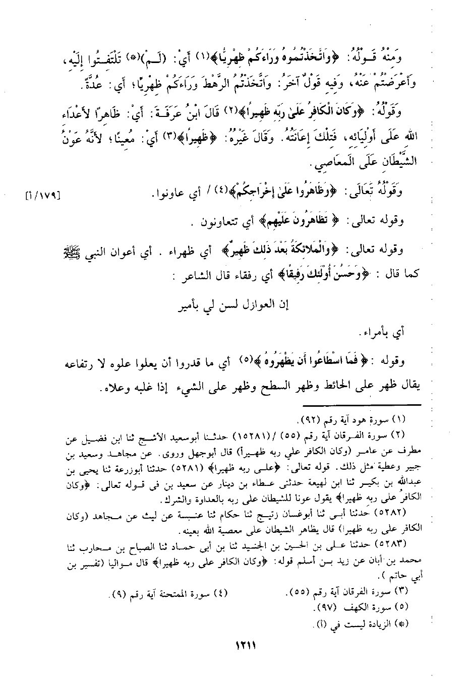 ومنه قوله: {واتخذتموه وراءكم ظهريا} أي: (لم) تلتفتوا إليه، وأعرضتم عنه، وفيه قول آخر: واتخذتم الرهط وراءكم ظهريا؛ أي: عدة.