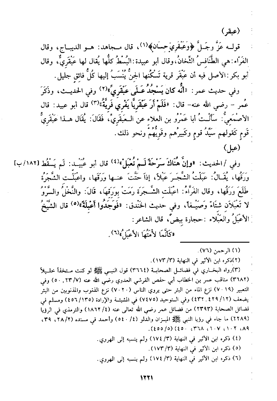 وفي حديث عمر: (أنه كان يسجد على عبقري) وفي الحديث، وذكر عمر- رضي الله عنه- قال: (فلم أر عبقريا يفري فرية) قال أبو عبيد: قال الأصمعي: سألت أبا عمرو بن العلاء عن العبقري، فقال: يقال هذا عبقري قوم كقولهم سيد قوم وكبيرهم وقويهم ونحو ذلك.