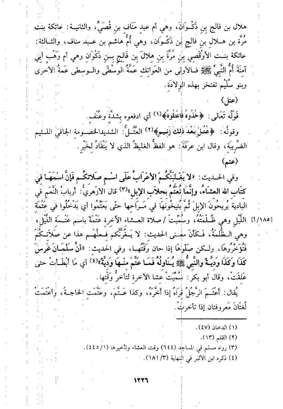 وفي الحديث: (لا يغلبنكم الأعراب على اسم صلاتكم فإن اسمها في كتاب الله العشاء، وإنما تعتم بحلاب الإبل) قال الأزهري: أرباب النعم في البادية يريحون الإبل ثم ينيخونها في مراحها حتى يعتموا أي يدخلوا في عتمة الليل وهي ظلمته، وسميت/ صلاة العشاء الآخرة عتمة باسم عتمة الليل، وهي الظلمة، فكأن معنى الحديُ: لا يغرنكم فعلهم هذا عن صلاتكم فتؤخروها، ولكن صلوها إذا حان وقتها، وفي الحديث: (أن سلمان غرس كذا وكذا ودية والنبي - صلى الله عليه وسلم - يناوله فما عتم منها ودية) أي ما أبطأت حتى علقت، وقال أبو بكر: سميت عشا الآخرة لتأخر وقتها.