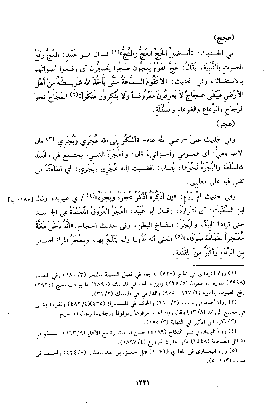 وفي حديث أم زرع: (إن أذكره أذكر عجره وبجره) /أي عيوبه، وقال ابن السكيت: أي أشراره، وقال أبو عبيد: العجر العروق المعتقدة في الجسد حتى تراها نابية، والبجر: انتفاخ البطن، وفي حديث الحجاج: (أنه دخل مكة معتجرا بعمامة سوداء) المعنى أنه لفها ولم يتلح بها، ومعجر المرأة أصغر من الرداء وأكبر من المقنعة.