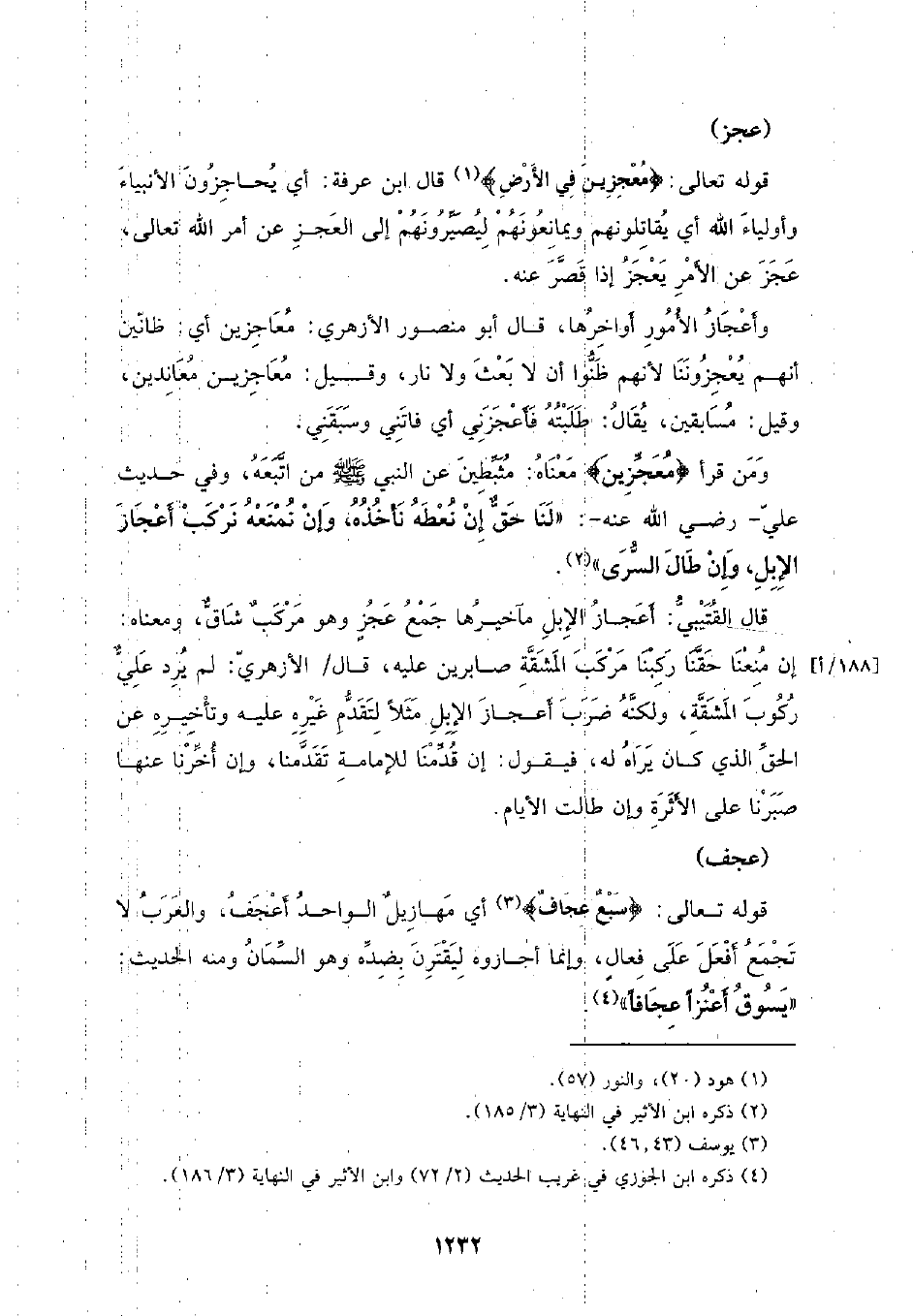 ومن قرأ} معجزين} معناه: مثبطين عن النبي - صلى الله عليه وسلم - من اتبعه، وفي حديث علي- رضي الله عنه-: (لنا حق إن نعطه نأخذه، وإن نمنعه نركب أعجاز الإبل، وإن طال السرى).
