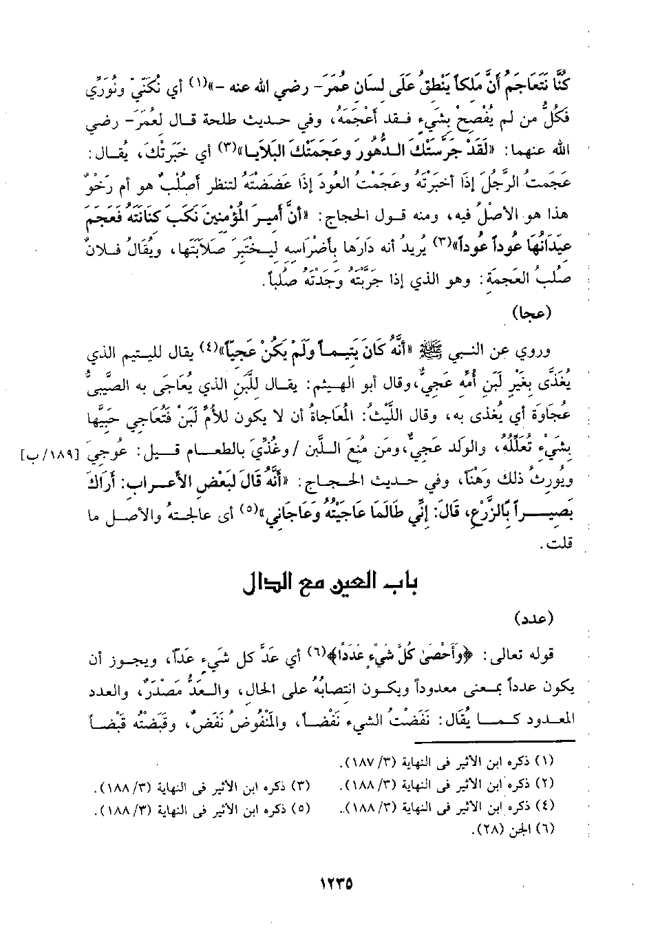 كنا نتعاجم أن ملكا ينطق على لسان عمر- رضي الله عنه-) أي نكني ونوري فكل من لم يفصح بشيء فقد أعجمه، وفي حديث طلحة قال لعمر- رضي الله عنهما: (لقد جرستك الدهور وعجمتك البلايا) أي خبرتك، يقال: عجمت الرجل إذا أخبرته وعجمت العود إذا غضضته لتنظر أصلب هو أم رخو هذا هو الأصل فيه، ومنه قول الحجاج: (أن أمير المؤمنين نكب كنانته فعجم عيدانها عودا عودا) يريد أنه دارها بأضراسه ليختبر صلابتها، ويقال فلان صلب العجمة: وهو الذي إذا جربته وجدته صلبا.