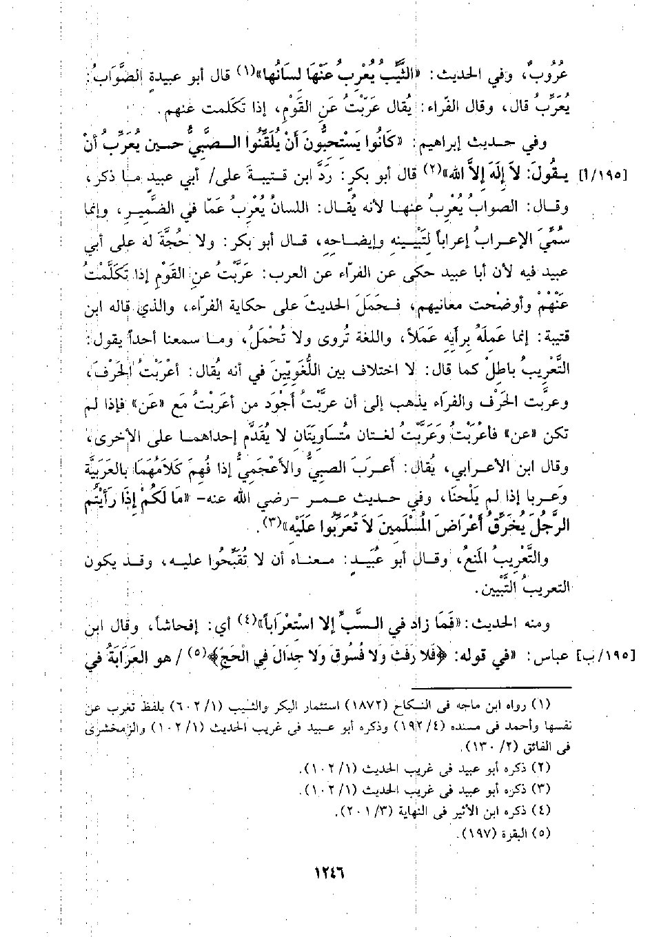وفي حديث إبراهيم: (كانوا يستحبون أن يلقنوا الصبي حين يعرب أن يقول: لا إله إلا الله) قال أبو بكر: رد ابن قتيبة على /أبي عبيد ما ذكر، وقال: الصواب يعرب عنها لأنه يقال: اللسان يعرب عما في الضمير، وإنما سمي الإعراب إعرابا لتبيينه وإيضاحه، قال أبو بكر: ولا حجة له على أبي عبيد فيه لأن أبا عبيد حكى عن الفراء عن العرب: عربت عن القوم إذا تكلمت عنهم وأوضحت معانيهم، فحمل الحديث على حكاية الفراء، والذي قاله ابن قتيبة: إنما علمه برأيه عملا، واللغة تروى ولا تحمل، وما سمعنا أحدا يقول: التعريب باطل كما قال: لا اختلاف بين اللغويين في أنه يقال: أعربت الحرف، وعربت الحرف والفراء يذهب إلى أن عربت أجود من أعربت مع (عن) فإذا لم تكن (عن) فأعربت وعربت لغتان متساويتان لا يقدم إحداهما على الأخرى، وقال ابن الأعرابي، يقال: أعرب الصبي والأعجمي إذا فهم كلامهما بالعربية وعربا إذا لم يلحنا، وفي حديث عمر- رضي الله عنه- (ما لكم إذا رأيتم الرجل يخرق أعراض المسلمين لا تعربوا عليه).