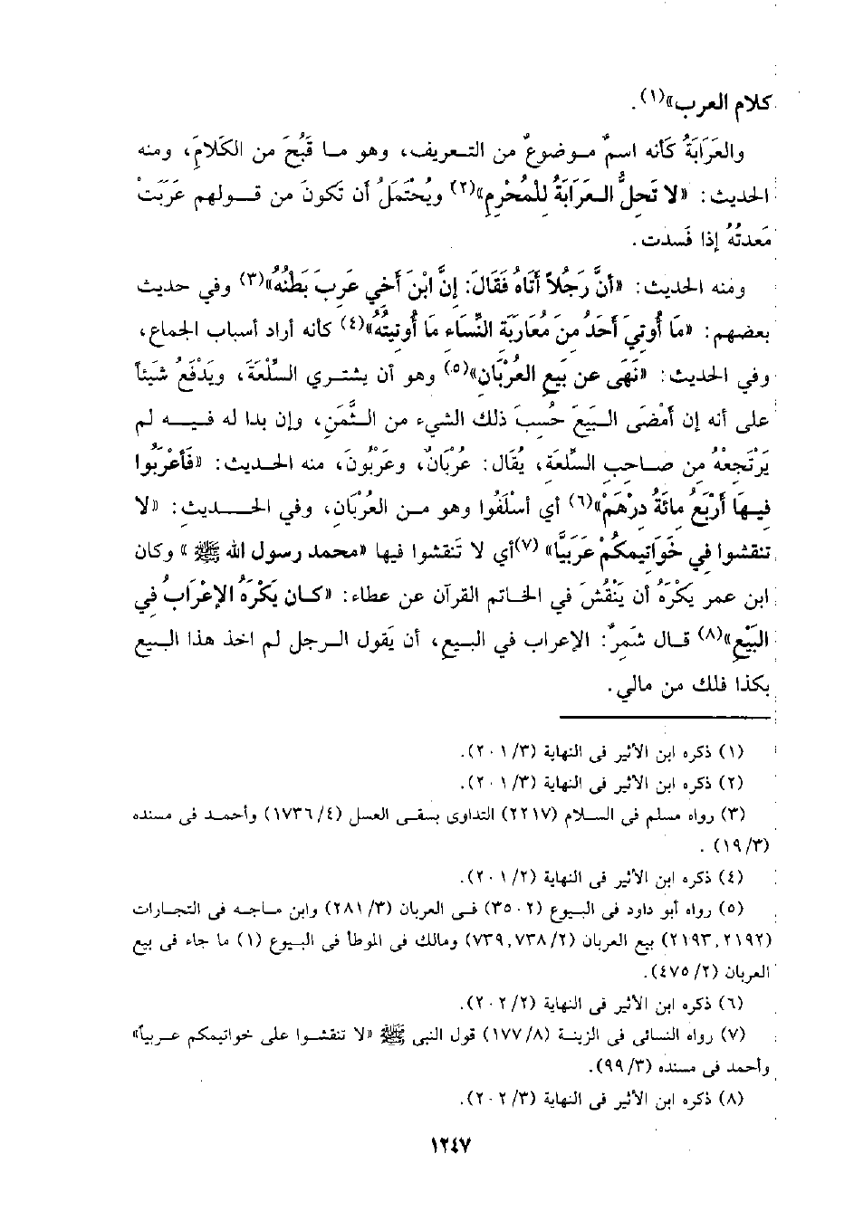 ومنه الحديث: (أن رجلا أتاه فقال: إن ابن أخي عرب بطنه) وفي حديث بعضهم: (ما أوتي أحد من معاربة النساء ما أوتيته) كأنه أراد أسباب الجماع، وفي الحديث: (نهى عن بيع العربان) وهو أن يشتري السلعة، ويدفع شيئا على أنه إن أمضى البيع حسب ذلك الشيء من الثمن، وإن بدا له فيه لم يرتجعه من صاحب السلعة، يقال: عربان، وعربون، منه الحديث: (فأعربوا فيها أربع مائة درهم) أي أسلفوا وهو من العربان، وفي الحديث: (إلا تنقشوا في خواتيمكم عربيا) أي لا تنقشوا فيها (محمد رسول الله - صلى الله عليه وسلم -) وكان ابن عمر يكره أن ينقش في الخاتم القرآن عن عطاء: (كان يكره الإعراب في البيع) قال شمر: الإعراب في البيع، أن يقول الرجل لم أخذ هذا البيع بكذا فلك من مالي.