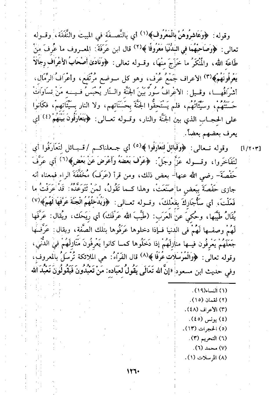 وقوله: {وعاشروهن بالمعروف} أي بالنصفة في المبيت والنفقة، وقوله تعالى: {وصاحبهما في الدنيا معروفا} قال ابن عرفة: المعروف ما عرف من طاعة الله، والمنكر ما خرج منها، وقوله تعالى: {ونادى أصحاب الأعراف رجالا يعرفونهم} الأعراف جمع عرف، وهو كل موضع مرتفع، وأعراف الرمال، أشرافها، وقيل: الأعراف سور بين الجنة والنار يحبس فيه من تساوات حسنتهم، وسيئاتهم، فلم يستحقوا الجنة بحسناتهم، ولا النار بسيئاتهم، فكانوا على الحجاب الذي بين الجنة والنار، وقوله تعالى: {يتعارفون بينهم} أي يعرفون بعضهم بعضا.