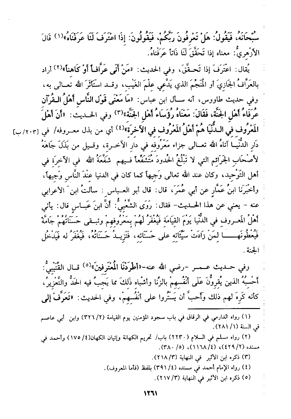 يقال: اعترف إذا تحقق، وفي الحديث: (من أتى عرافا أو كاهنا) أراد بالعراف الجازي أو المنجم الذي يدعي علم الغيب، وقد استأثر الله تعالى به، وفي حديث طاوو، أنه سأل ابن عباس: (ما معنى قول الناس أهل القرآن عرفاء أهل الجنة، فقال: معناه رؤساء أهل الجنة) وفي الحديث: (أن أهل المعروف في الدنيا هم أهل المعروف في الآخرة) أي من بذل معروفه/ في دار الدنيا آتاه الله تعالى جزاء معروفه في دار الآخرة، وقيل من بذل جاهه لأصحاب الجرائم التي لا تبلغ الحدود متشفعا فيهم شفعة الله في الآخرة في أهل التوحيد، وكان عند الله تعالى وجيها كما كان في الدنيا عند الناس وجيها، وأخبرنا ابن عمار عن أبي عمر، قال: قال أبو العباس: سألت ابن الأعرابي عنه- يعني عن هذا الحديث- فقال: روى الشعبي: أن ابن عباس قال: يأتي أهل المعروف في الدنيا يوم القيامة فيغفر لهم بمعروفهم وتبقى حسناتهم جامة فيعطونها لمن زادت سيئاته على حسناته، فتزيد حسناته، فيغفر له فيدخل الجنة.